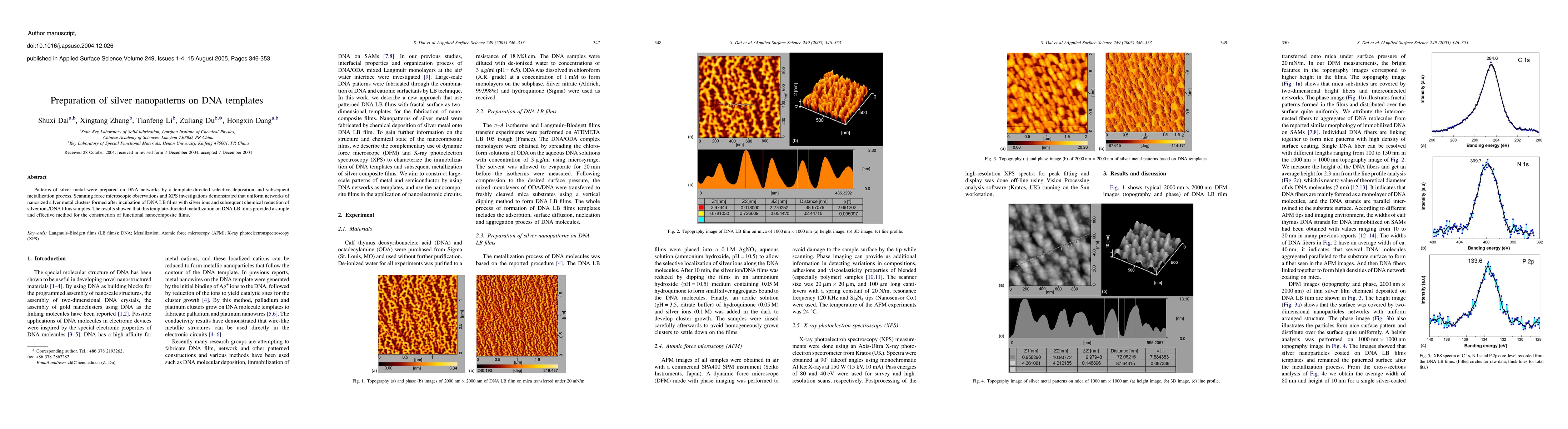 This study presents a method for creating uniform silver nanopatterns on DNA templates using a template-directed deposition and chemical reduction process. The resulting silver metal clusters on DNA LB films were confirmed through scanning force microscopy and XPS analysis, demonstrating the potential for constructing functional nanocomposite films.