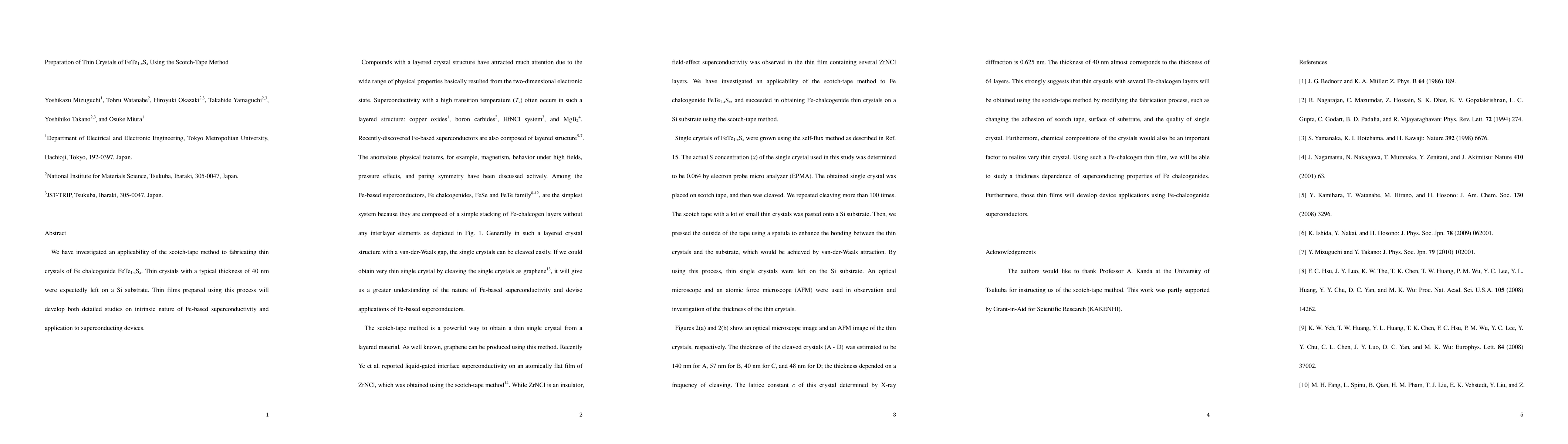 This study explores the scotch-tape method for fabricating thin FeTe1-xSx crystals, achieving 40 nm thickness on Si substrates. These thin films could enhance both fundamental studies on Fe-based superconductivity and potential superconducting device applications.