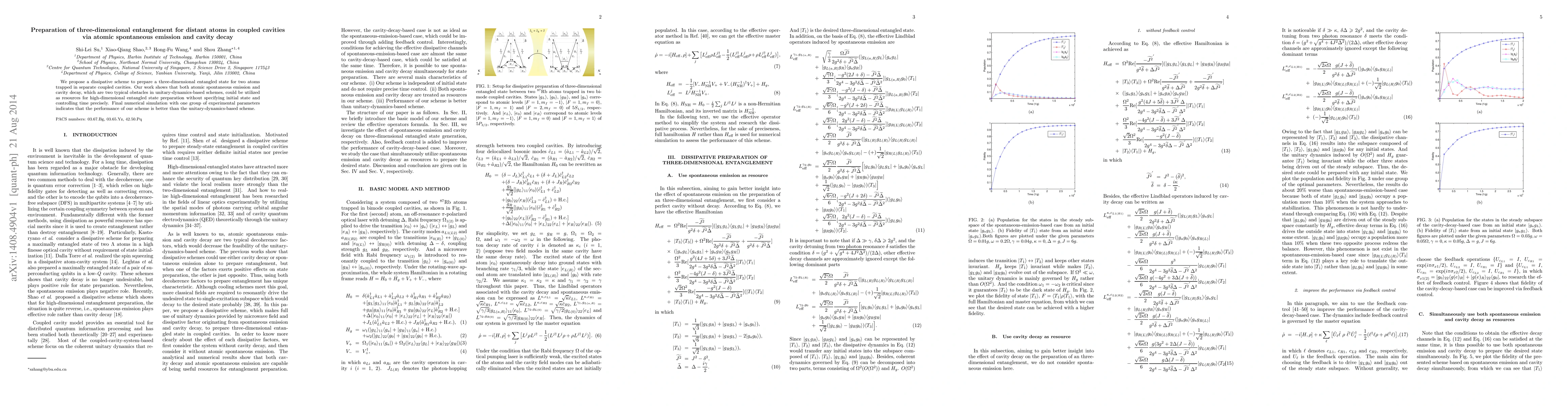 This paper proposes a dissipative scheme for preparing three-dimensional entangled states for two distant atoms in coupled cavities, leveraging atomic spontaneous emission and cavity decay. The method outperforms unitary-dynamics-based schemes by not requiring precise initial state specification or time control.