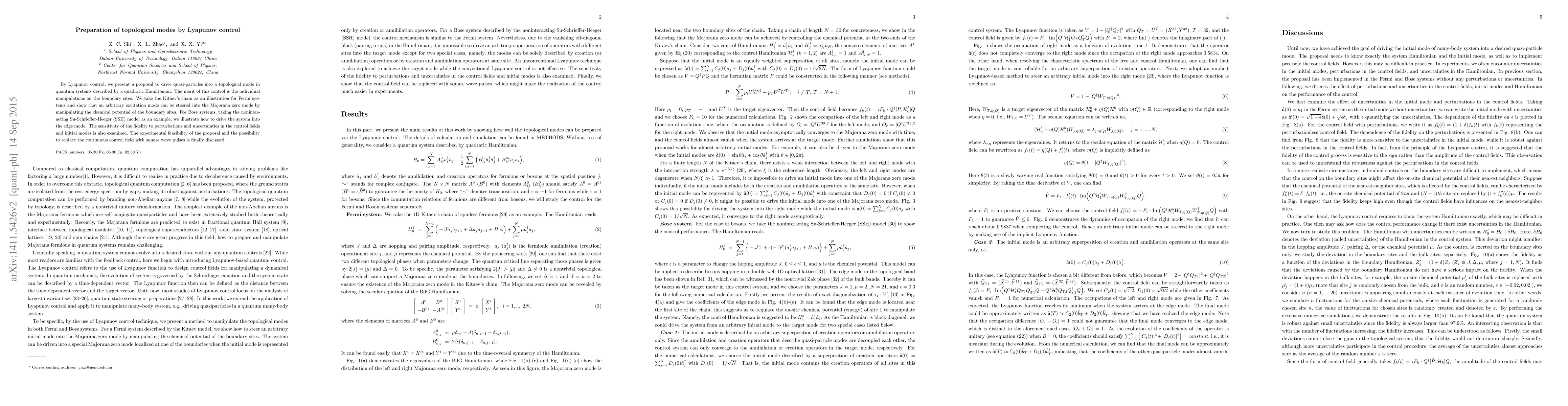 By Lyapunov control, we present a proposal to drive quasi-particles into a topological mode in quantum systems described by a quadratic Hamiltonian. The merit of this control is the individual manipulations on the boundary sites. We take the Kitaev's chain as an illustration for Fermi systems and show that an arbitrary excitation mode can be steered into the Majorana zero mode by manipulating the chemical potential of the boundary sites. For Bose systems, taking the noninteracting Su-Schrieffer-Heeger (SSH) model as an example, we illustrate how to drive the system into the edge mode. The sensitivity of the fidelity to perturbations and uncertainties in the control fields and initial modes is also examined. The experimental feasibility of the proposal and the possibility to replace the continuous control field with square wave pulses is finally discussed.