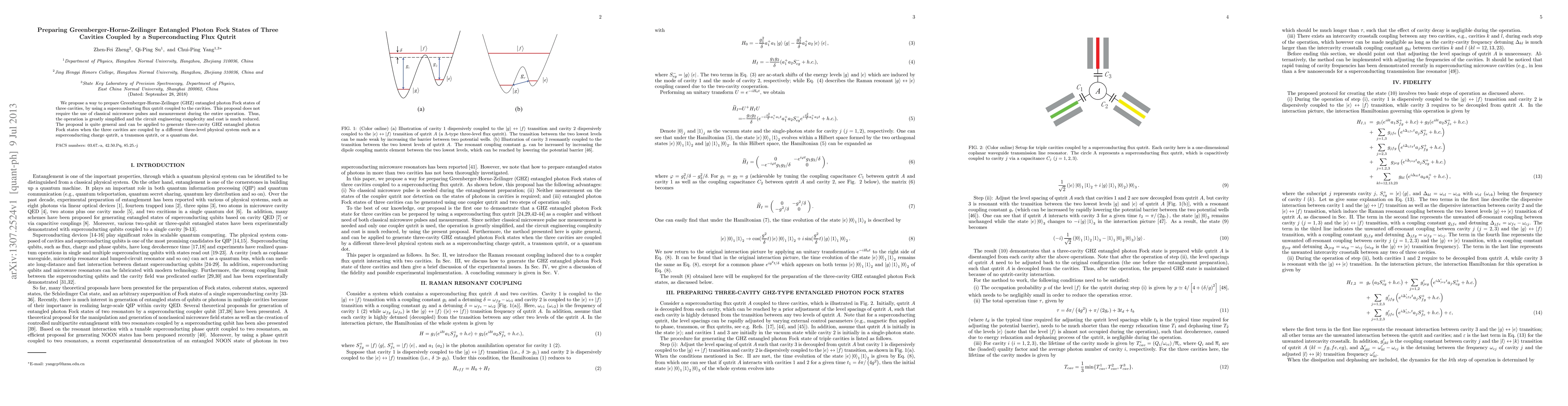 This paper proposes a method to prepare Greenberger-Horne-Zeilinger (GHZ) entangled photon Fock states in three coupled cavities using a superconducting flux qutrit, without requiring classical microwave pulses or measurements, thus simplifying the operation and reducing engineering complexity. The approach is versatile and applicable to various three-level systems.