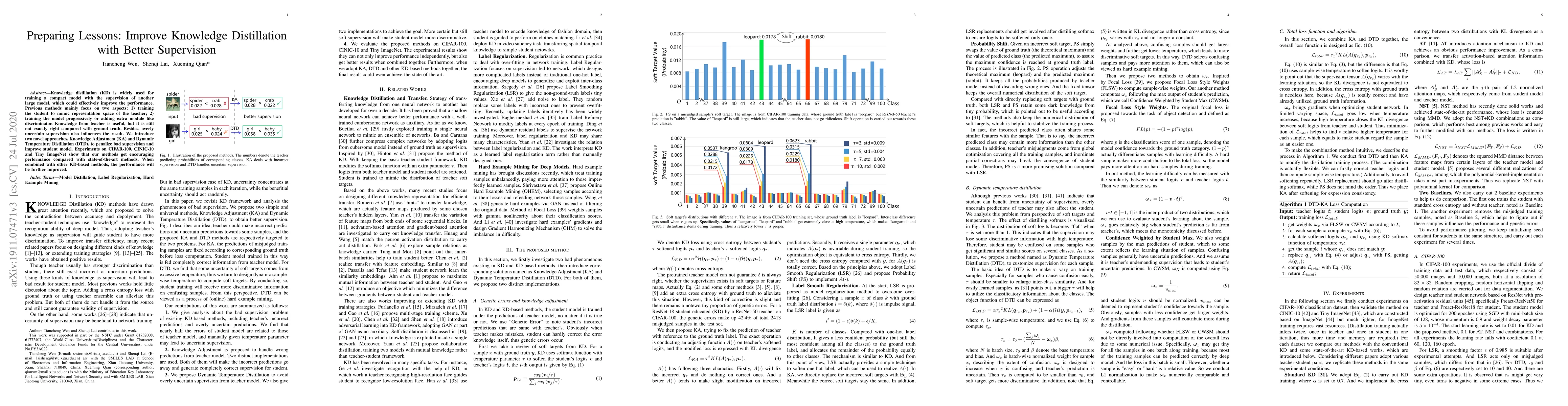 Knowledge distillation (KD) is widely used for training a compact model with the supervision of another large model, which could effectively improve the performance. Previous methods mainly focus on two aspects: 1) training the student to mimic representation space of the teacher; 2) training the model progressively or adding extra module like discriminator. Knowledge from teacher is useful, but it is still not exactly right compared with ground truth. Besides, overly uncertain supervision also influences the result. We introduce two novel approaches, Knowledge Adjustment (KA) and Dynamic Temperature Distillation (DTD), to penalize bad supervision and improve student model. Experiments on CIFAR-100, CINIC-10 and Tiny ImageNet show that our methods get encouraging performance compared with state-of-the-art methods. When combined with other KD-based methods, the performance will be further improved.