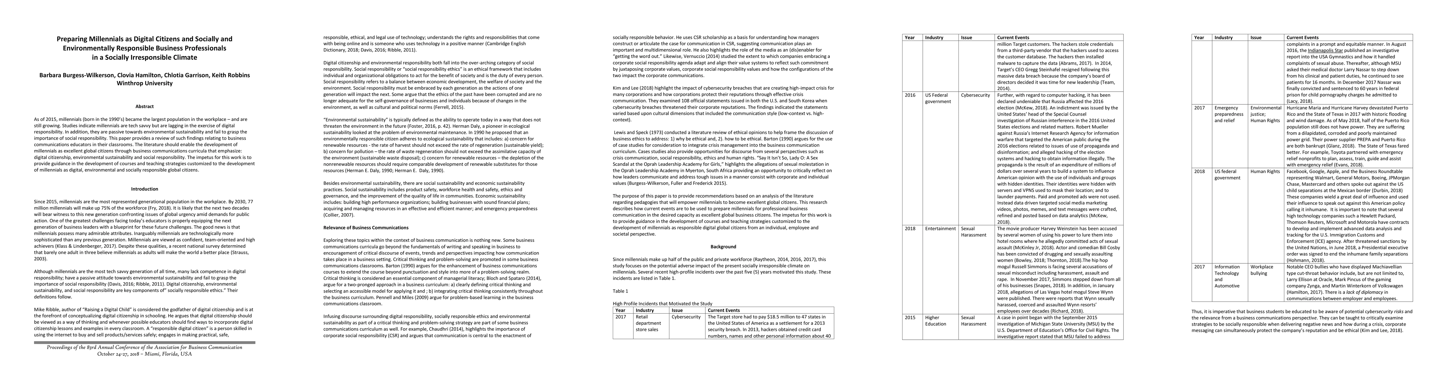 This paper reviews the shortcomings of millennials in digital responsibility, environmental sustainability, and social responsibility, emphasizing the need for business communications curricula to foster these qualities. It aims to guide educators in developing tailored courses and strategies to cultivate millennials as responsible global citizens.