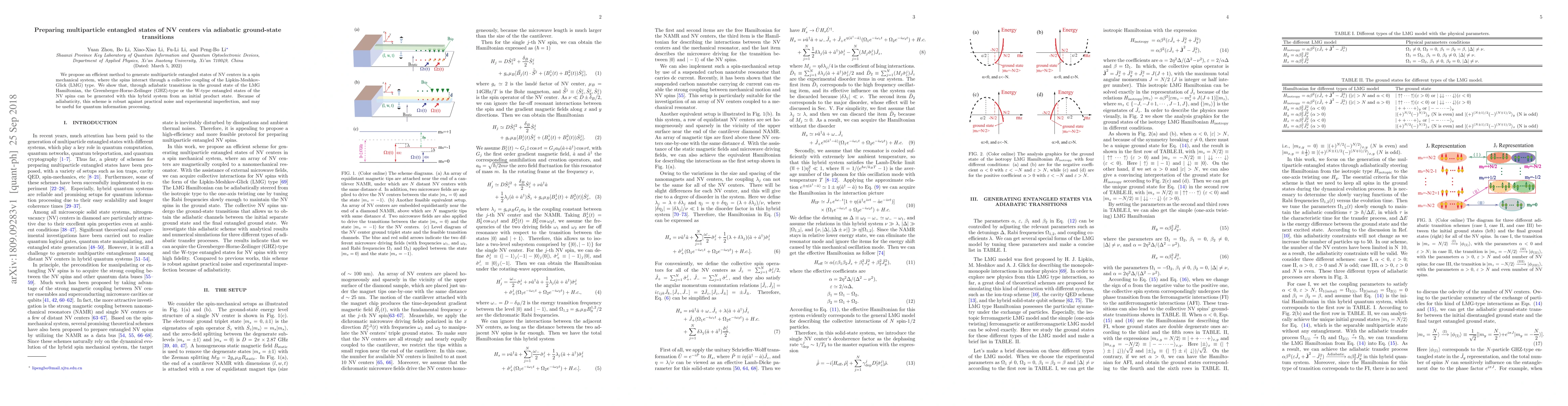 This paper proposes an efficient method to generate multiparticle entangled states of NV centers using adiabatic ground-state transitions in a spin mechanical system with collective Lipkin-Meshkov-Glick coupling. The method can produce GHZ-type or W-type entangled states, demonstrating robustness against noise and practical imperfections, which is valuable for quantum information processing.