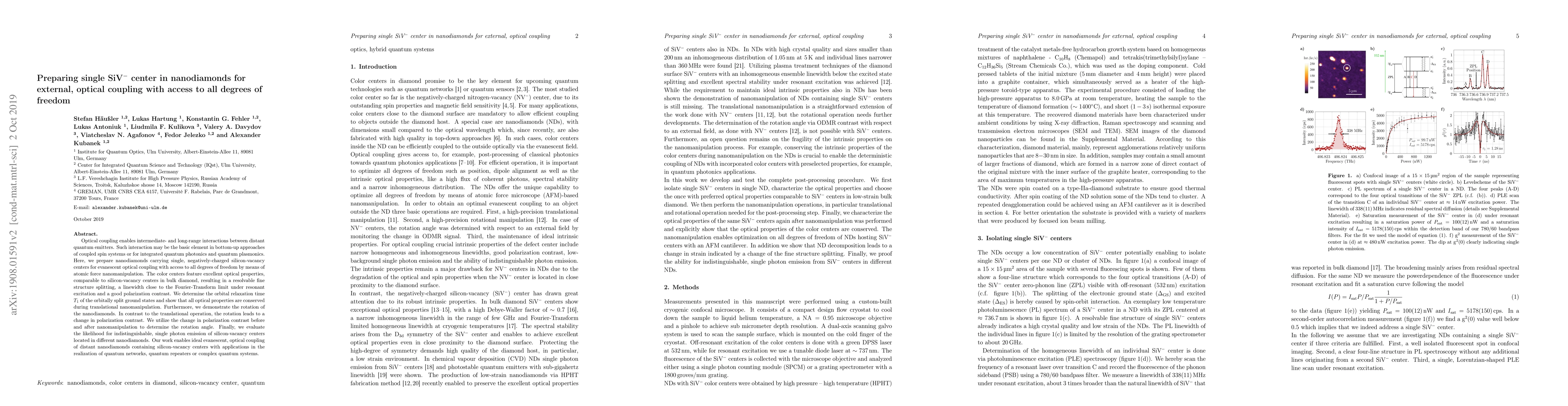 This paper details the preparation of nanodiamonds with single, negatively-charged silicon-vacancy centers for optical coupling, demonstrating excellent optical properties and the ability to manipulate these nanodiamonds via atomic force nanomanipulation. The study shows the potential for quantum networks and complex quantum systems through evanescent optical coupling.