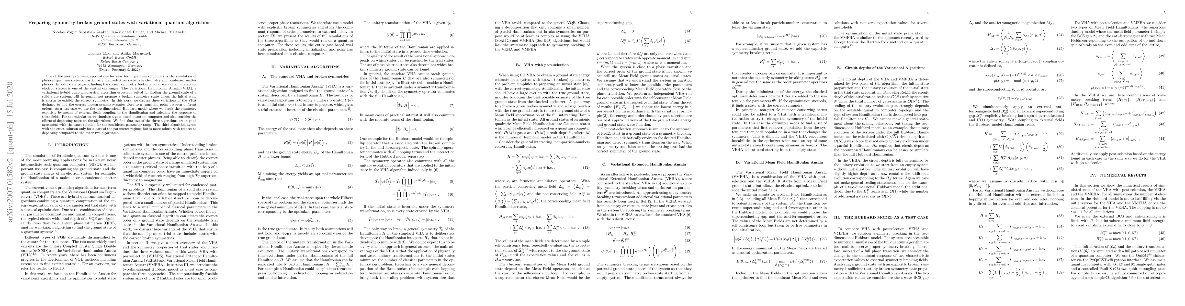 One of the most promising applications for near term quantum computers is the simulation of physical quantum systems, particularly many-electron systems in chemistry and condensed matter physics. In solid state physics, finding the correct symmetry broken ground state of an interacting electron system is one of the central challenges. The Variational Hamiltonian Ansatz (VHA), a variational hybrid quantum-classical algorithm especially suited for finding the ground state of a solid state system, will in general not prepare a broken symmetry state unless the initial state is chosen to exhibit the correct symmetry. In this work, we discuss three variations of the VHA designed to find the correct broken symmetry states close to a transition point between different orders. As a test case we use the two-dimensional Hubbard model where we break the symmetry explicitly by means of external fields coupling to the Hamiltonian and calculate the response to these fields. For the calculation we simulate a gate-based quantum computer and also consider the effects of dephasing noise on the algorithms. We find that two of the three algorithms are in good agreement with the exact solution for the considered parameter range. The third algorithm agrees with the exact solution only for a part of the parameter regime, but is more robust with respect to dephasing compared to the other two algorithms.