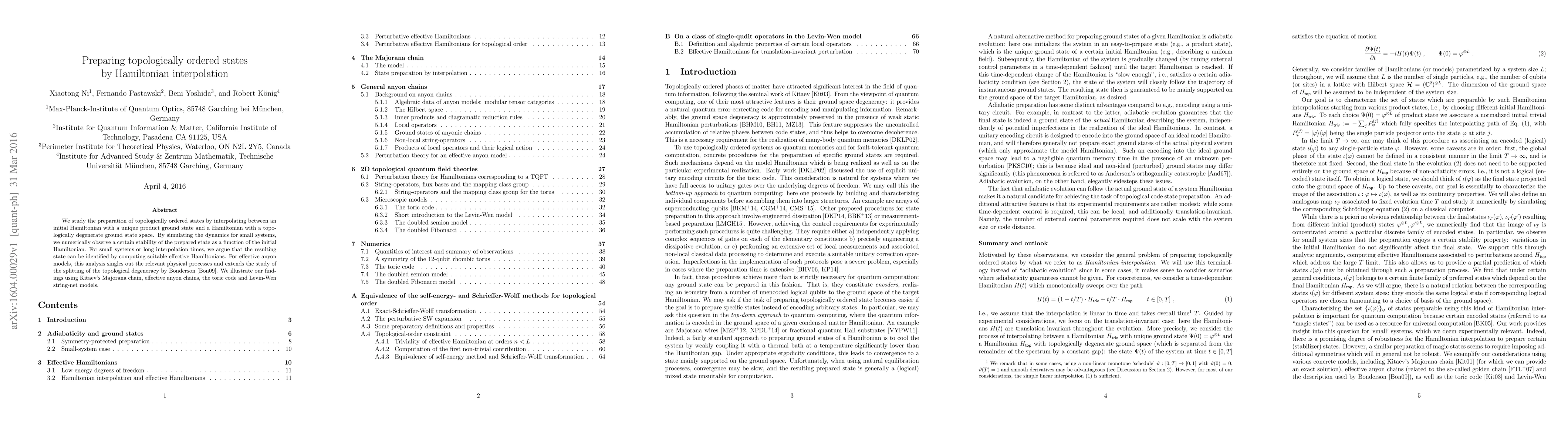 This paper investigates the preparation of topologically ordered states through Hamiltonian interpolation, observing stability in small systems. It identifies the relevant physical processes and extends the study of topological degeneracy, illustrated through models like Kitaev's Majorana chain and the toric code.