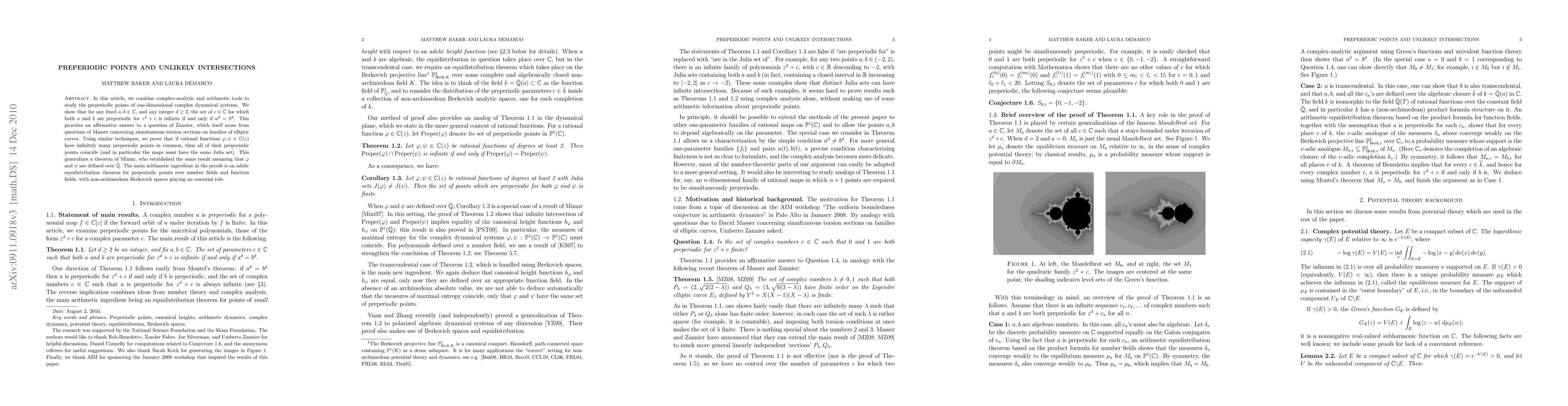 This paper combines complex-analytic and arithmetic methods to investigate the preperiodic points of complex dynamical systems, proving that the set of values c for which both a and b are preperiodic for z^d+c is infinite if and only if a^d = b^d. It also generalizes a theorem on the Julia sets of rational functions sharing infinitely many preperiodic points.