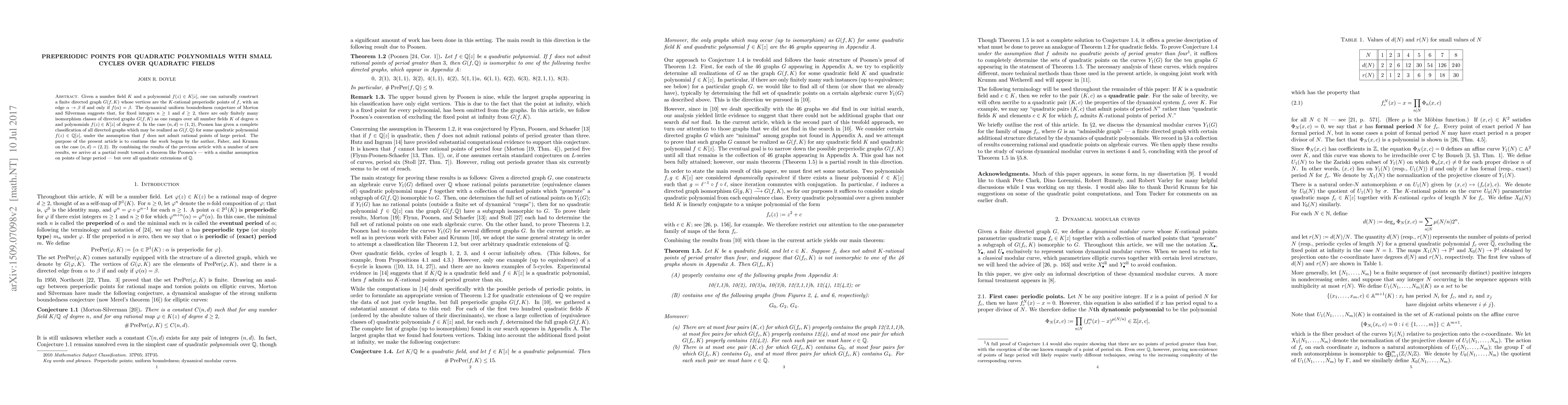 Given a number field $K$ and a polynomial $f(z) \in K[z]$, one can naturally construct a finite directed graph $G(f,K)$ whose vertices are the $K$-rational preperiodic points of $f$, with an edge $\alpha \to \beta$ if and only if $f(\alpha) = \beta$. The dynamical uniform boundedness conjecture of Morton and Silverman suggests that, for fixed integers $n \ge 1$ and $d \ge 2$, there are only finitely many isomorphism classes of directed graphs $G(f,K)$ as one ranges over all number fields $K$ of degree $n$ and polynomials $f(z) \in K[z]$ of degree $d$. In the case $(n,d) = (1,2)$, Poonen has given a complete classification of all directed graphs which may be realized as $G(f,\mathbb{Q})$ for some quadratic polynomial $f(z) \in \mathbb{Q}[z]$, under the assumption that $f$ does not admit rational points of large period. The purpose of the present article is to continue the work begun by the author, Faber, and Krumm on the case $(n,d) = (2,2)$. By combining the results of the previous article with a number of new results, we arrive at a partial result toward a theorem like Poonen's -- with a similar assumption on points of large period -- but over all quadratic extensions of $\mathbb{Q}$.