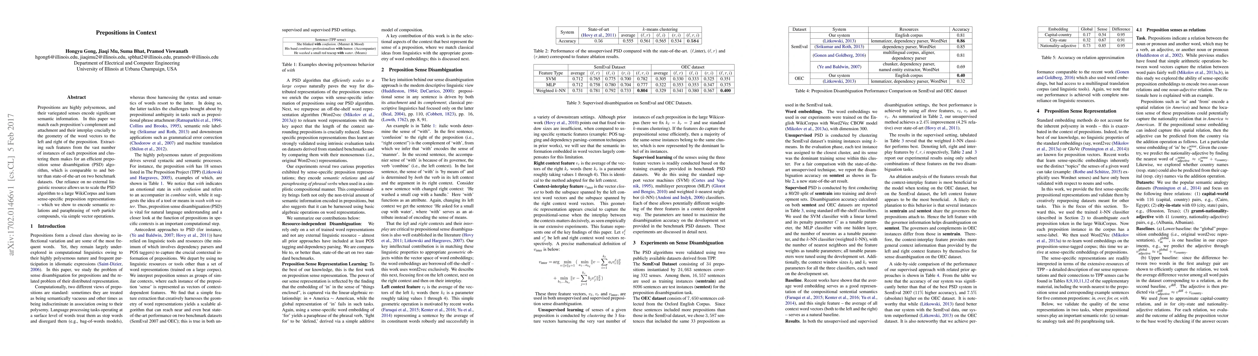The paper proposes a preposition sense disambiguation (PSD) algorithm that leverages context features derived from word vectors, achieving performance comparable to state-of-the-art methods without relying on external linguistic resources. The approach scales to large corpora and learns sense-specific preposition representations.