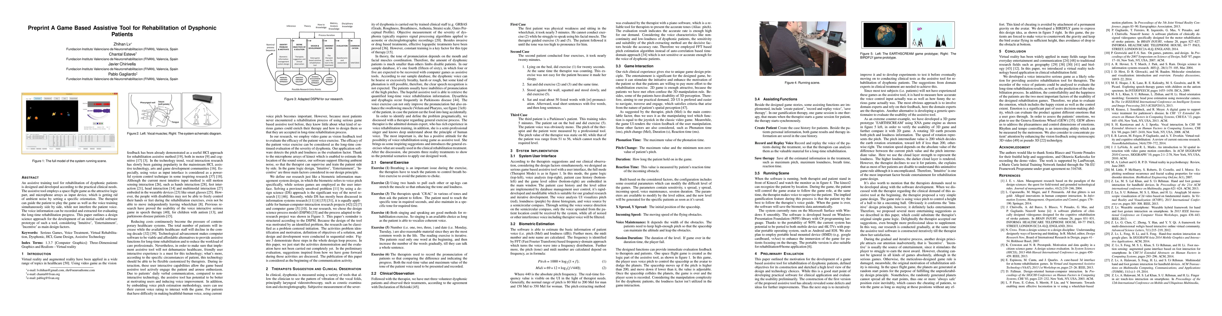 This paper presents a game-based assistive tool for dysphonic patients' rehabilitation, employing a space flight game and microphone arrays to eliminate ambient noise. The tool allows simultaneous game play and voice training, with recorded voice data for progress evaluation. The design focuses on intuitive, entertaining, and incentive elements.
