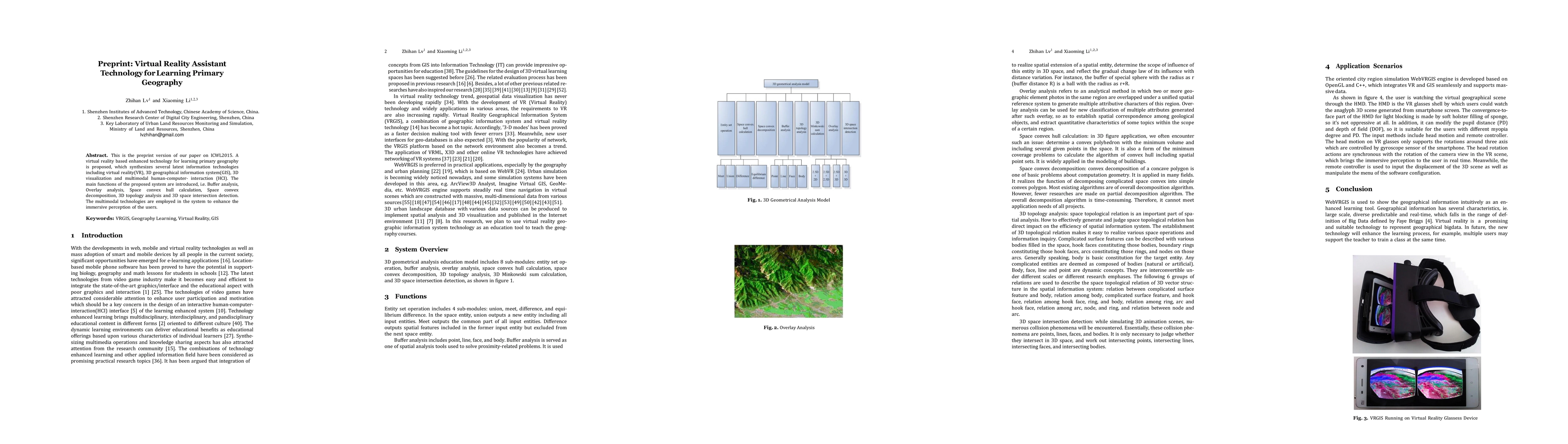 This paper proposes a virtual reality-based enhanced technology for learning primary geography, integrating VR, 3D GIS, 3D visualization, and multimodal HCI. The system features functions like buffer analysis, overlay analysis, and 3D topology analysis, aiming to enhance immersive learning through multimodal interaction.