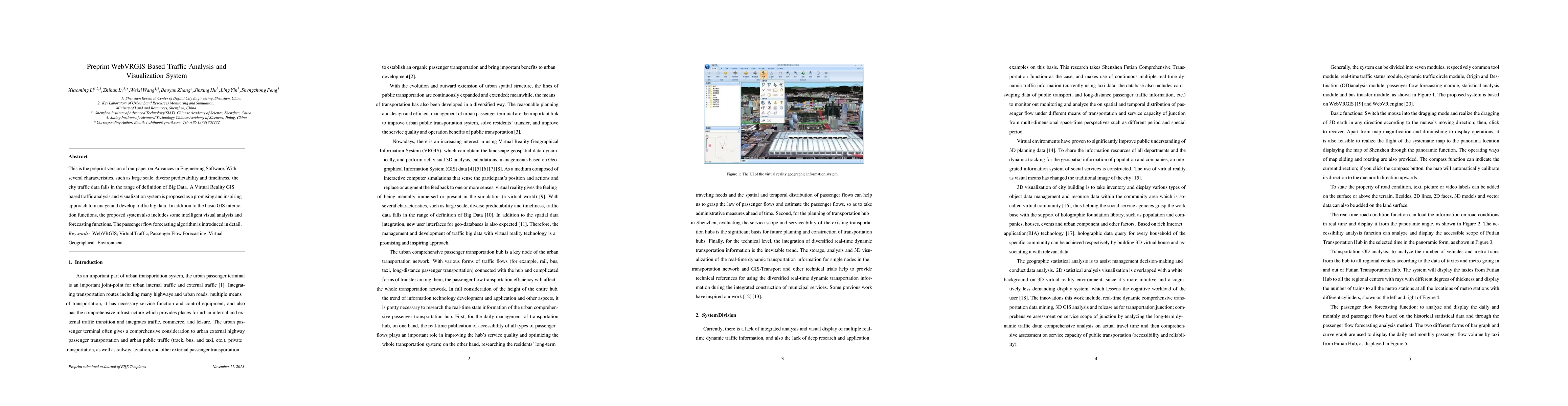 This paper proposes a WebVRGIS-based traffic analysis and visualization system for managing big data in urban traffic. The system integrates GIS interaction, intelligent visual analysis, and a detailed passenger flow forecasting algorithm.