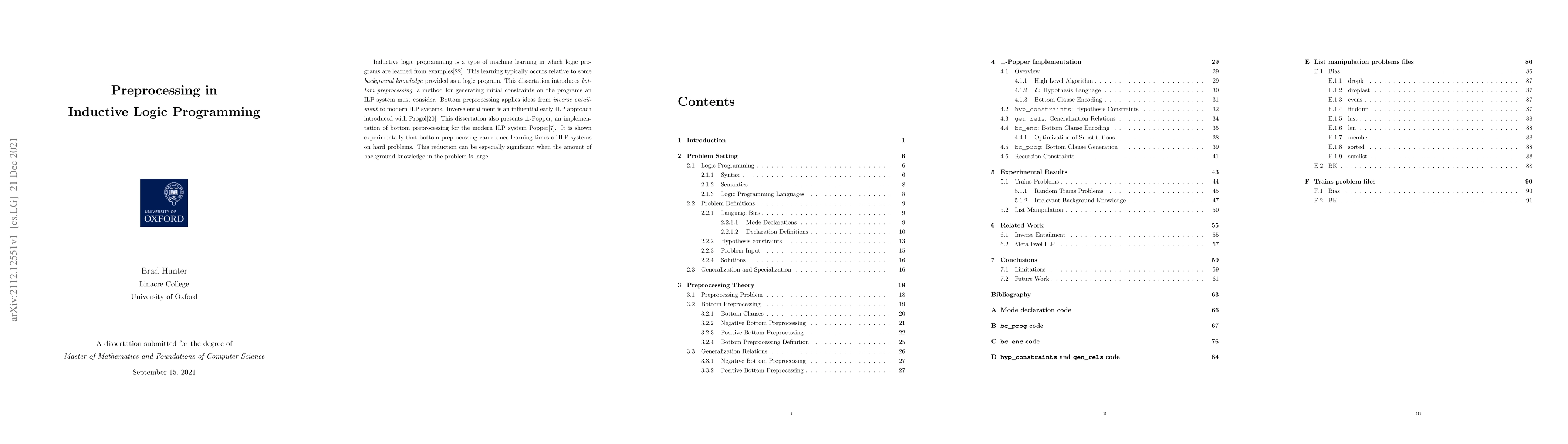 Inductive logic programming is a type of machine learning in which logic programs are learned from examples. This learning typically occurs relative to some background knowledge provided as a logic program. This dissertation introduces bottom preprocessing, a method for generating initial constraints on the programs an ILP system must consider. Bottom preprocessing applies ideas from inverse entailment to modern ILP systems. Inverse entailment is an influential early ILP approach introduced with Progol. This dissertation also presents $\bot$-Popper, an implementation of bottom preprocessing for the modern ILP system Popper. It is shown experimentally that bottom preprocessing can reduce learning times of ILP systems on hard problems. This reduction can be especially significant when the amount of background knowledge in the problem is large.