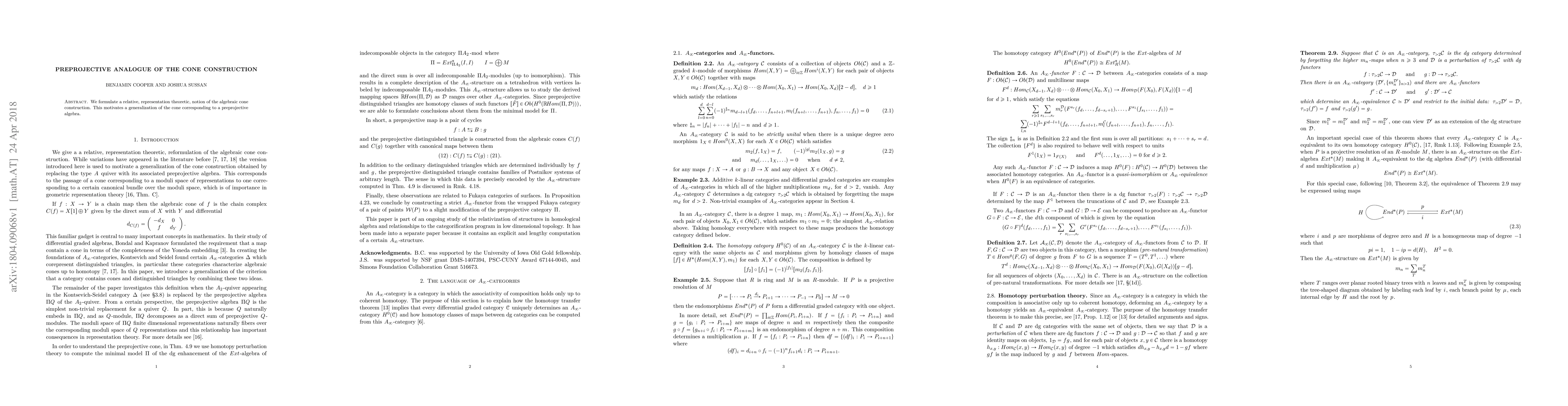 Summary: This paper introduces a representation-theoretic concept of the algebraic cone construction and extends it to a preprojective algebra, providing a relative analogue of the traditional cone construction.