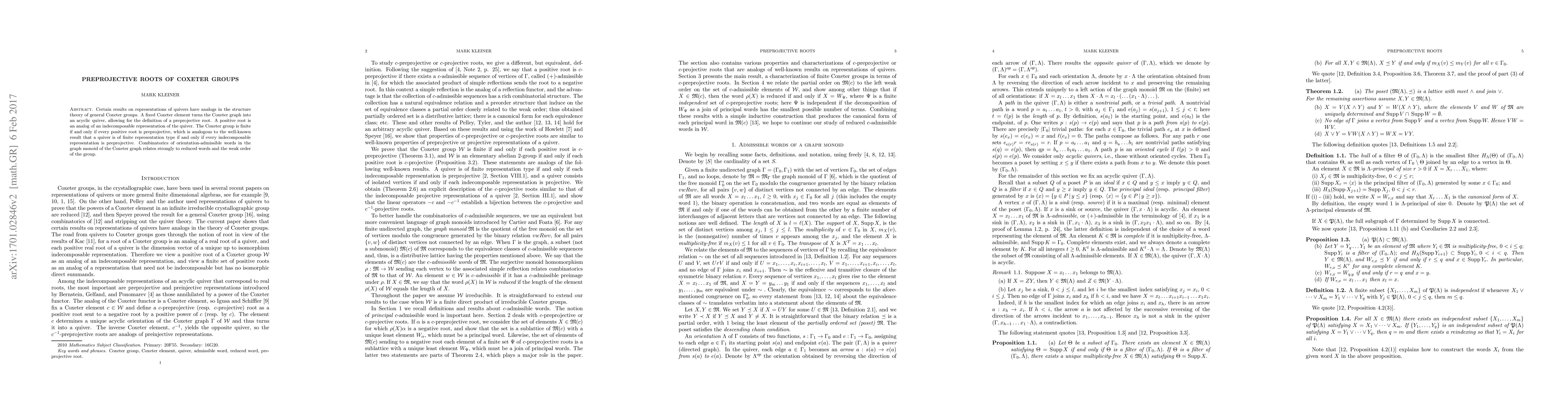 Certain results on representations of quivers have analogs in the structure theory of general Coxeter groups. A fixed Coxeter element turns the Coxeter graph into an acyclic quiver, allowing for the definition of a preprojective root. A positive root is an analog of an indecomposable representation of the quiver. The Coxeter group is finite if and only if every positive root is preprojective, which is analogous to the well-known result that a quiver is of finite representation type if and only if every indecomposable representation is preprojective. Combinatorics of orientation-admissible words in the graph monoid of the Coxeter graph relates strongly to reduced words and the weak order of the group.