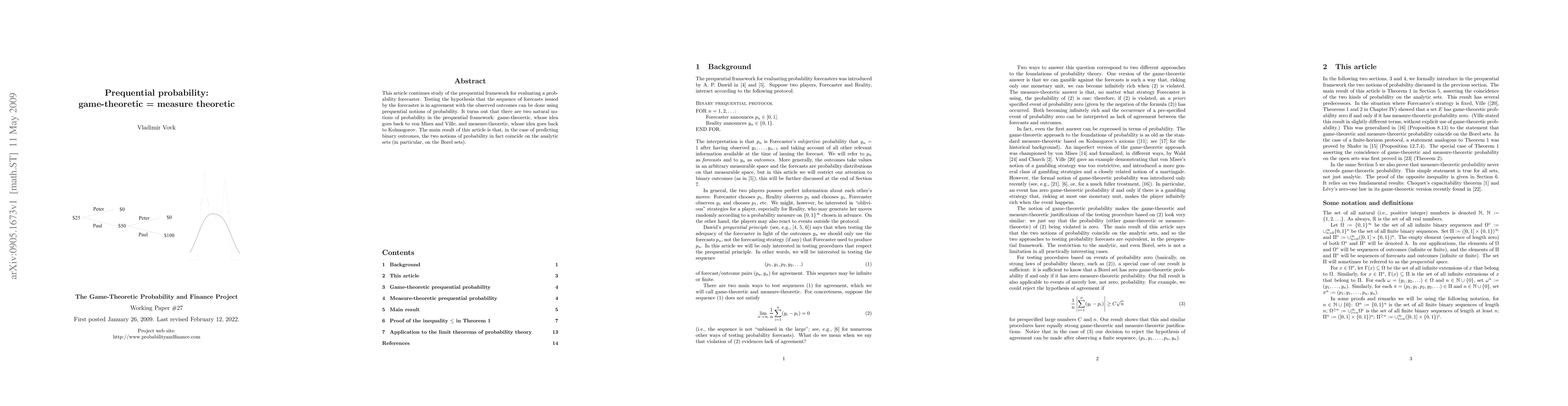 This article continues study of the prequential framework for evaluating a probability forecaster. Testing the hypothesis that the sequence of forecasts issued by the forecaster is in agreement with the observed outcomes can be done using prequential notions of probability. It turns out that there are two natural notions of probability in the prequential framework: game-theoretic, whose idea goes back to von Mises and Ville, and measure-theoretic, whose idea goes back to Kolmogorov. The main result of this article is that, in the case of predicting binary outcomes, the two notions of probability in fact coincide on the analytic sets (in particular, on the Borel sets).