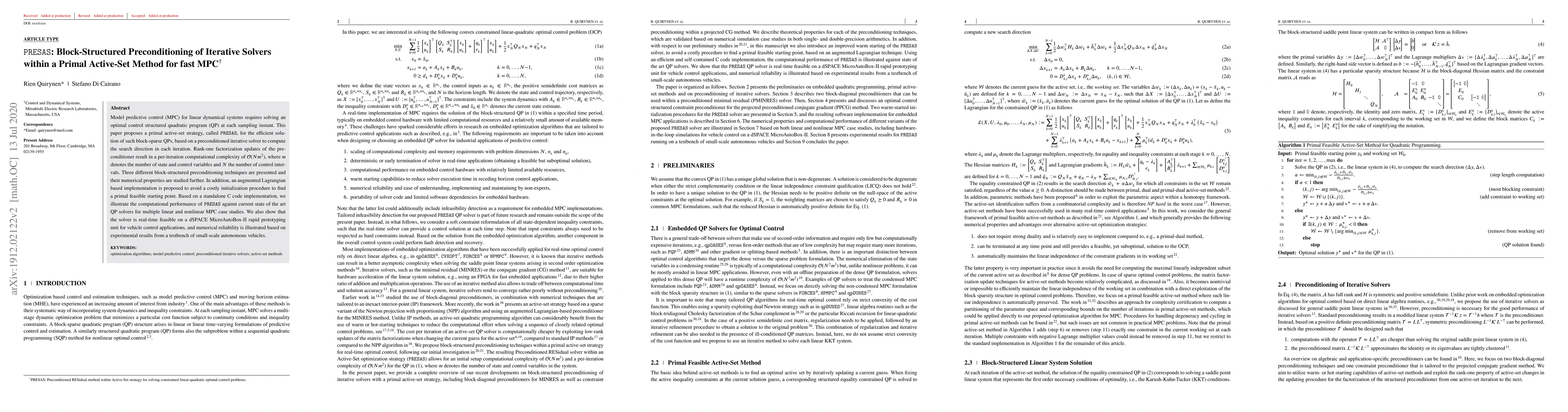 This paper introduces PRESAS, a primal active-set method using block-structured preconditioning for efficient solution of block-sparse quadratic programs in model predictive control. The method employs preconditioned iterative solvers and demonstrates real-time feasibility for vehicle control applications, outperforming current state-of-the-art QP solvers.