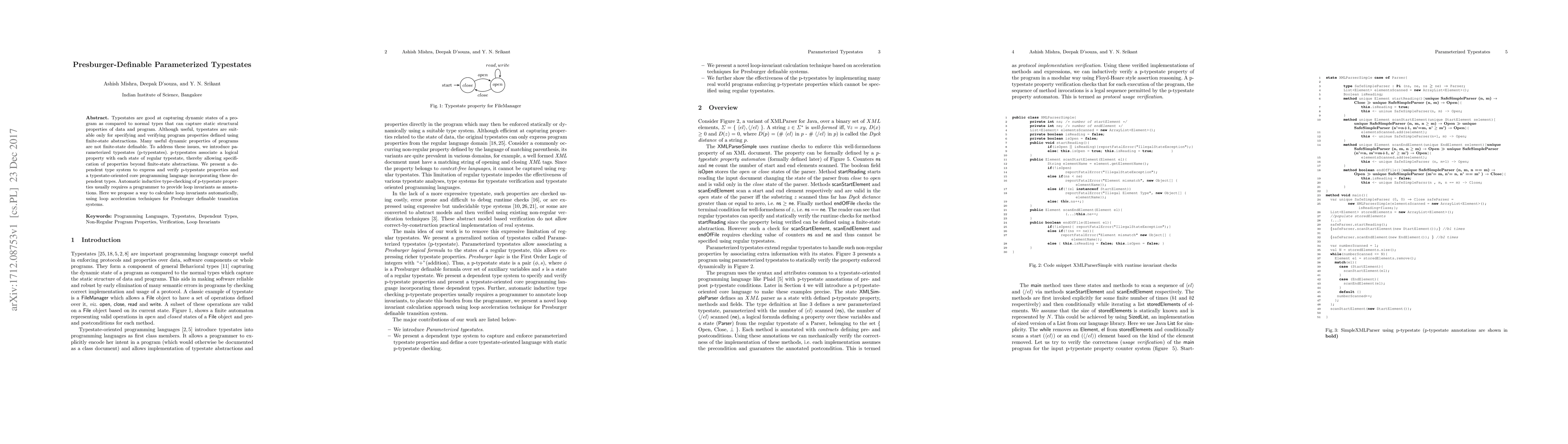 This paper introduces parameterized typestates (p-typestates) to extend the capabilities of traditional typestates for capturing dynamic program properties beyond finite-state abstractions. It presents a dependent type system and a core programming language to express and verify these properties, and proposes an automatic method for calculating loop invariants using loop acceleration techniques for Presburger definable transition systems.