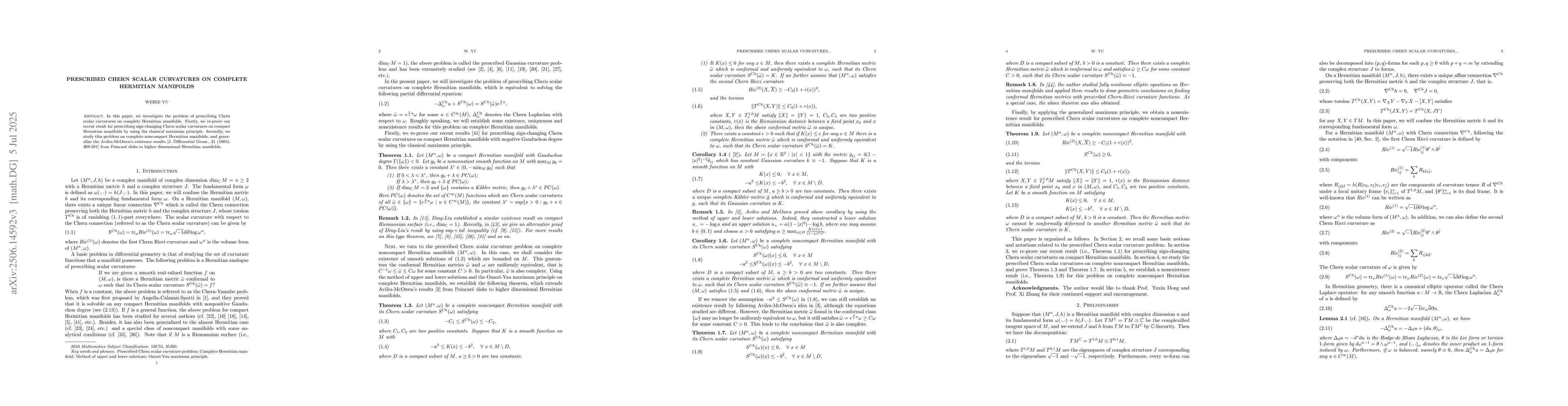 This paper re-proves a result on prescribing sign-changing Chern scalar curvatures on compact Hermitian manifolds using the maximum principle. It further extends Aviles-McOwen's theorem to higher dimensional complete noncompact Hermitian manifolds, generalizing their Poincaré disk findings.