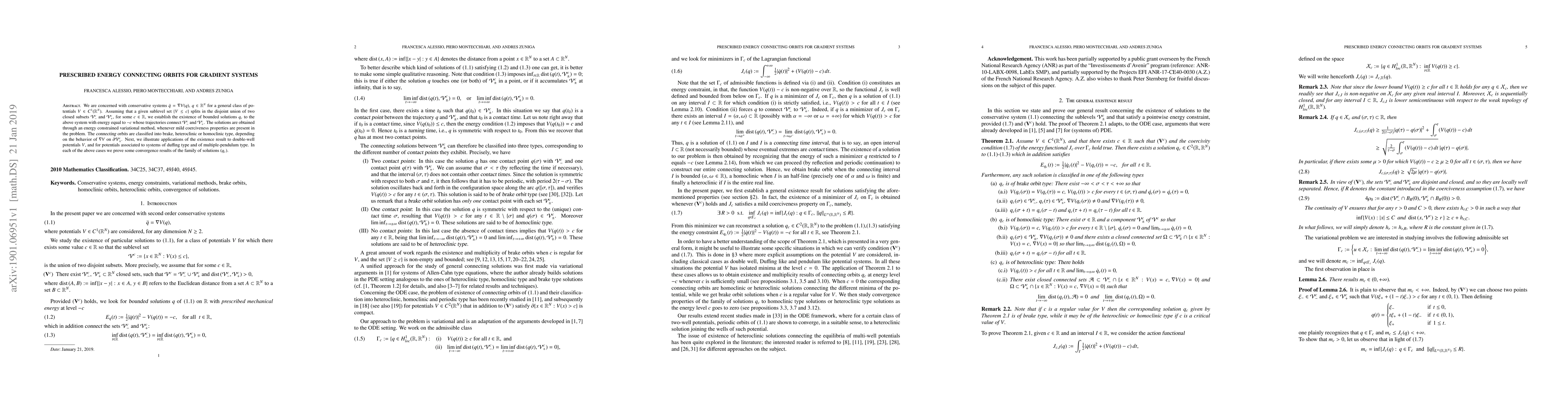 We are concerned with conservative systems $\ddot{q}=\nabla V(q), \; q\in\mathbb{R}^N$ for a general class of potentials $V\in C^1(\mathbb{R}^N)$. Assuming that a given sublevel set $\{V\leq c\}$ splits in the disjoint union of two closed subsets $\mathcal{V}^c_-$ and $\mathcal{V}^c_+$, for some $c\in\mathbb{R}$, we establish the existence of bounded solutions $q_c$ to the above system with energy equal to $-c$ whose trajectories connect $\mathcal{V}^c_-$ and $\mathcal{V}^c_+$. The solutions are obtained through an energy constrained variational method, whenever mild coerciveness properties are present in the problem. The connecting orbits are classified into brake, heteroclinic or homoclinic type, depending on the behavior of $\nabla V$ on $\partial\mathcal{V}^c_{\pm}$. Next, we illustrate applications of the existence result to double-well potentials $V$, and for potentials associated to systems of Duffing type and of multiple-pendulum type. In each of the above cases we prove some convergence results of the family of solutions $(q_c)$.