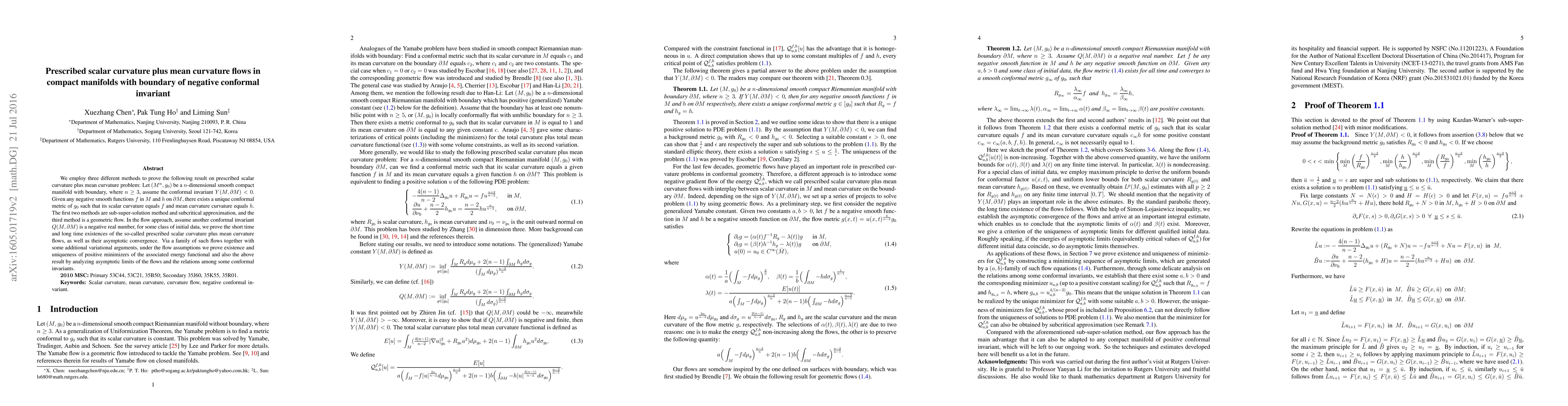 We employ three different methods to prove the following result on prescribed scalar curvature plus mean curvature problem: Let $(M^n,g_0)$ be a $n$-dimensional smooth compact manifold with boundary, where $n \geq 3$, assume the conformal invariant $Y(M,\partial M)<0$. Given any negative smooth functions $f$ in $M$ and $h$ on $\partial M$, there exists a unique conformal metric of $g_0$ such that its scalar curvature equals $f$ and mean curvature curvature equals $h$. The first two methods are sub-super-solution method and subcritical approximation, and the third method is a geometric flow. In the flow approach, assume another conformal invariant $Q(M,\pa M)$ is a negative real number, for some class of initial data, we prove the short time and long time existences of the so-called prescribed scalar curvature plus mean curvature flows, as well as their asymptotic convergence. Via a family of such flows together with some additional variational arguments, under the flow assumptions we prove existence and uniqueness of positive minimizers of the associated energy functional and also the above result by analyzing asymptotic limits of the flows and the relations among some conformal invariants.