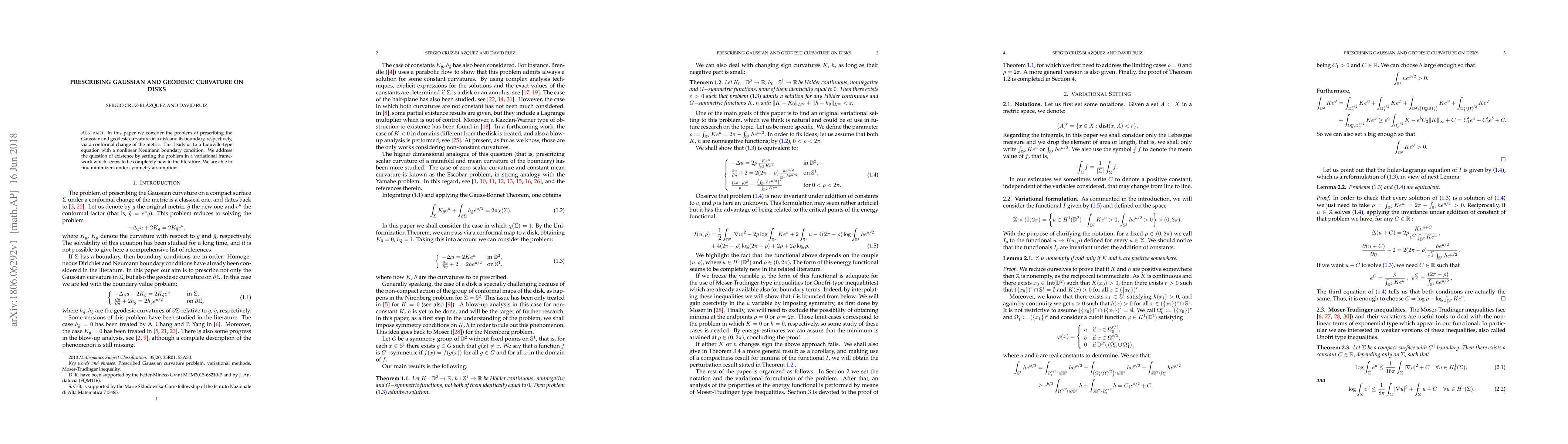 Researchers studied how to control the curvature of a disk's surface via a conformal change in its metric, leading to a new equation with non-linear boundary conditions. They found minimizers under symmetry assumptions using a variational framework.
