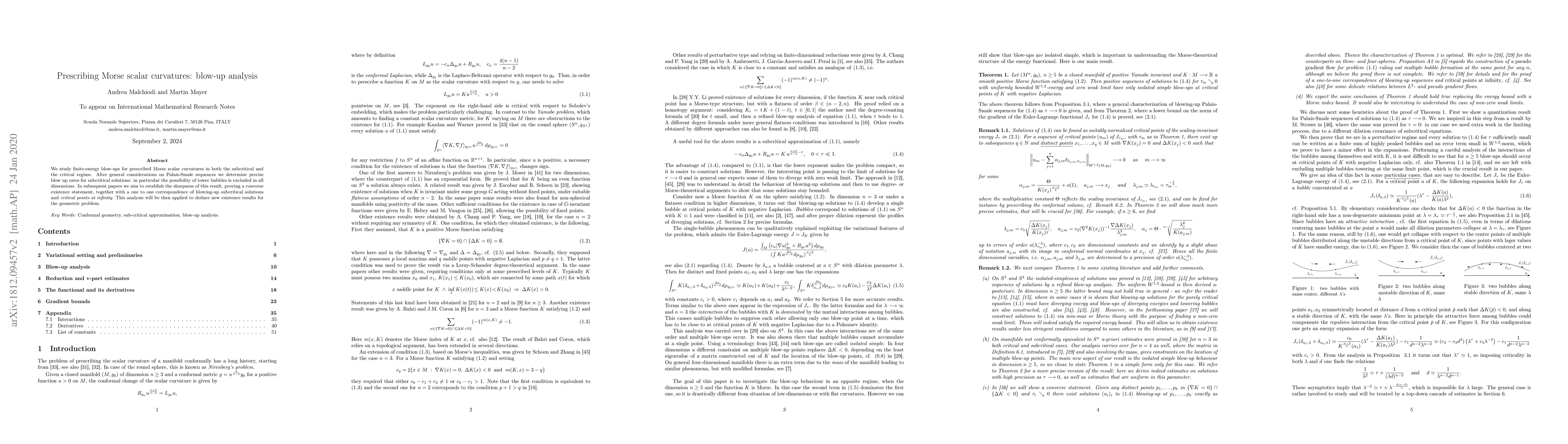 This paper investigates finite-energy blow-ups for prescribed Morse scalar curvatures, determining precise blow-up rates for subcritical solutions and excluding tower bubbles in all dimensions. Future work aims to establish the sharpness of these results and apply the findings to derive new geometric existence results.