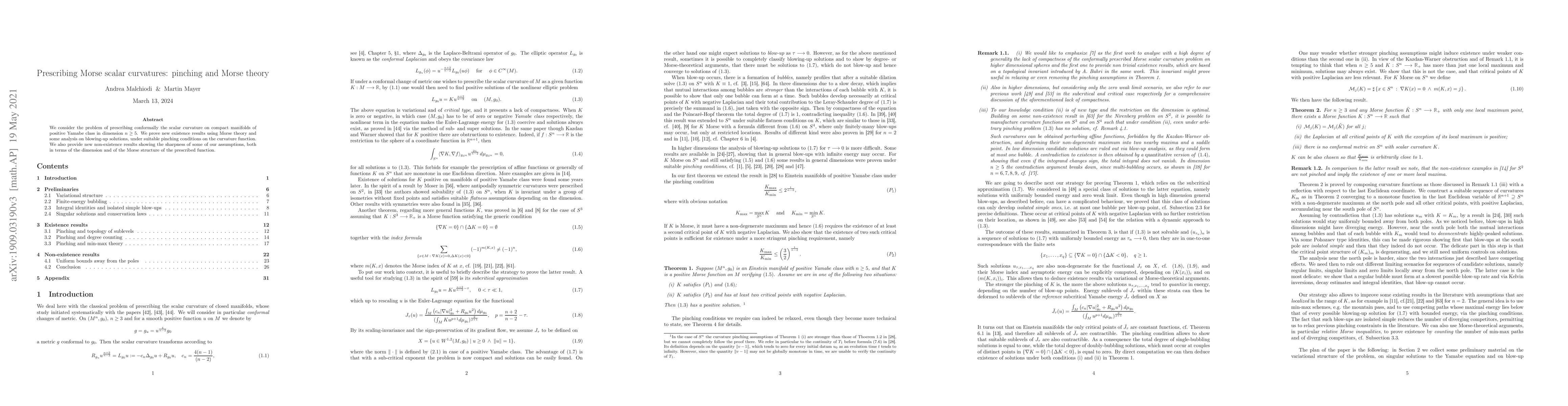 This paper presents new existence results for prescribing scalar curvature on compact manifolds using Morse theory and analysis of blowing-up solutions, under specific pinching conditions. It also highlights non-existence results demonstrating the necessity of certain assumptions regarding dimension and Morse structure.