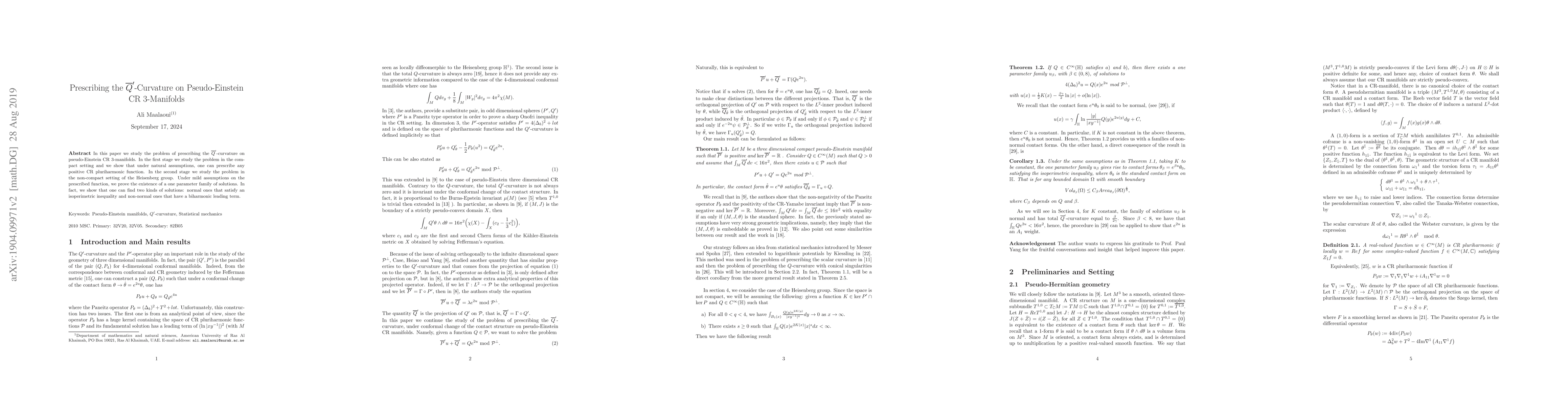 In this paper we study the problem of prescribing the $\bar Q^{\prime}$-curvature on pseudo-Einstein CR 3-manifolds. In the first stage we study the problem in the compact setting and we show that under natural assumptions, one can prescribe any positive CR pluriharmonic function. In the second stage we study the problem in the non-compact setting of the Heisenberg group. Under mild assumptions on the prescribed function, we prove the existence of a one parameter family of solutions. In fact, we show that one can find two kinds of solutions: normal ones that satisfy an isoperimetric inequality and non-normal ones that have a biharmonic leading term.
