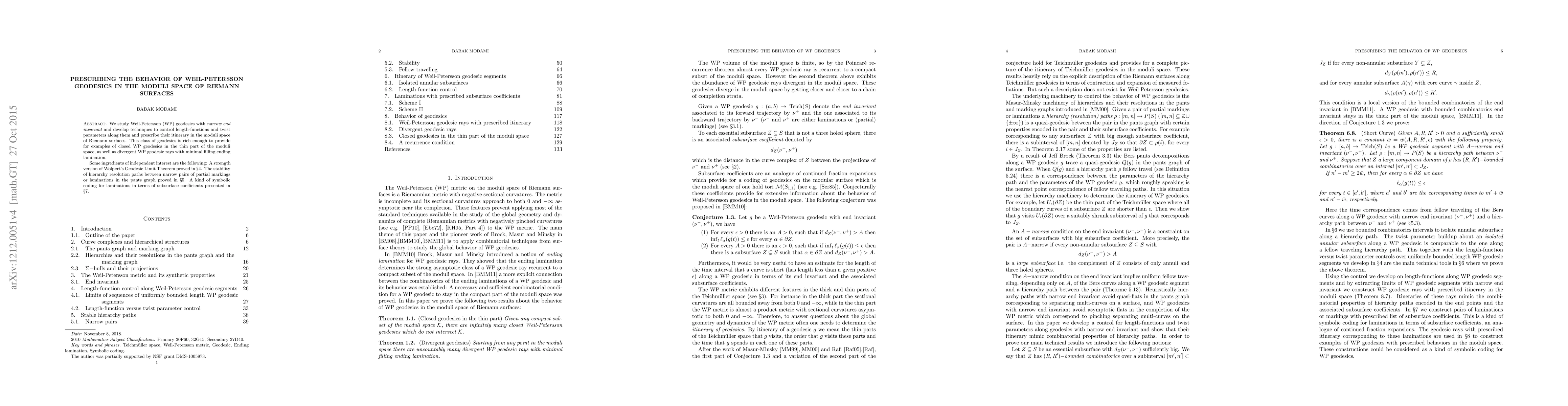 This paper develops techniques to control and prescribe the behavior of Weil-Petersson geodesics in the moduli space of Riemann surfaces, including closed geodesics and divergent rays. It also proves a strength version of Wolpert's Geodesic Limit Theorem, stability of hierarchy resolution paths, and presents a symbolic coding for laminations.