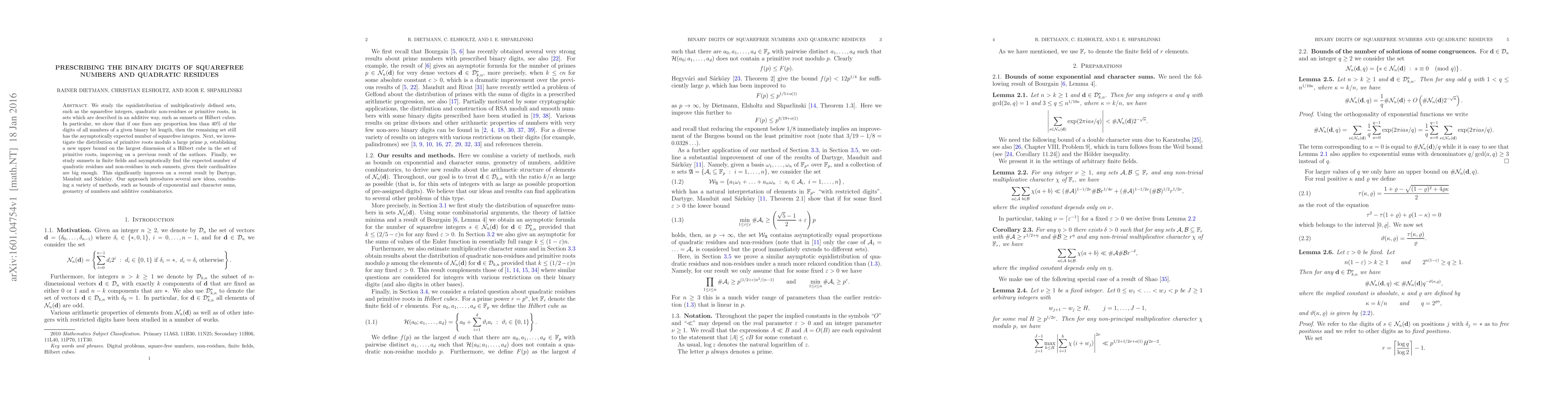This research paper investigates the distribution of squarefree numbers, quadratic residues, and primitive roots in various sets, establishing new bounds and improving previous results through a combination of methods.