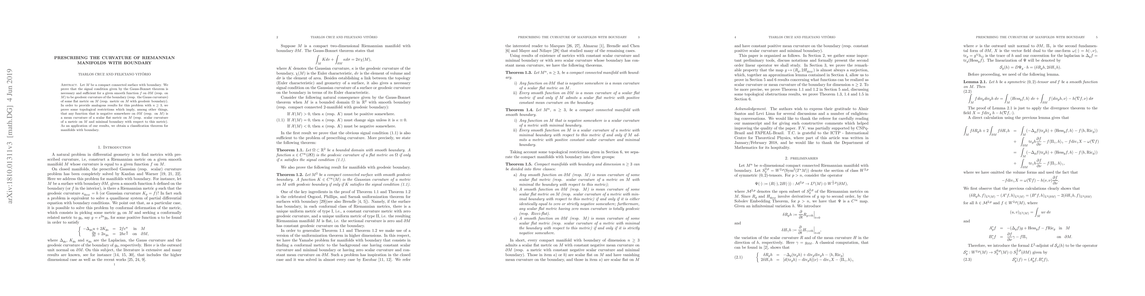 Let $M$ be a compact connected surface with boundary. We prove that the signal condition given by the Gauss-Bonnet theorem is necessary and sufficient for a given smooth function $f$ on $\partial M$ (resp. on $M$) to be geodesic curvature of the boundary (resp. the Gauss curvature) of some flat metric on $M$ (resp. metric on $M$ with geodesic boundary). In order to provide analogous results for this problem with $n\geq 3,$ we prove some topological restrictions which imply, among other things, that any function that is negative somewhere on $\partial M$ (resp. on $M$) is a mean curvature of a scalar flat metric on $M$ (resp. scalar curvature of a metric on $M$ and minimal boundary with respect to this metric). As an application of our results, we obtain a classification theorem for manifolds with boundary.