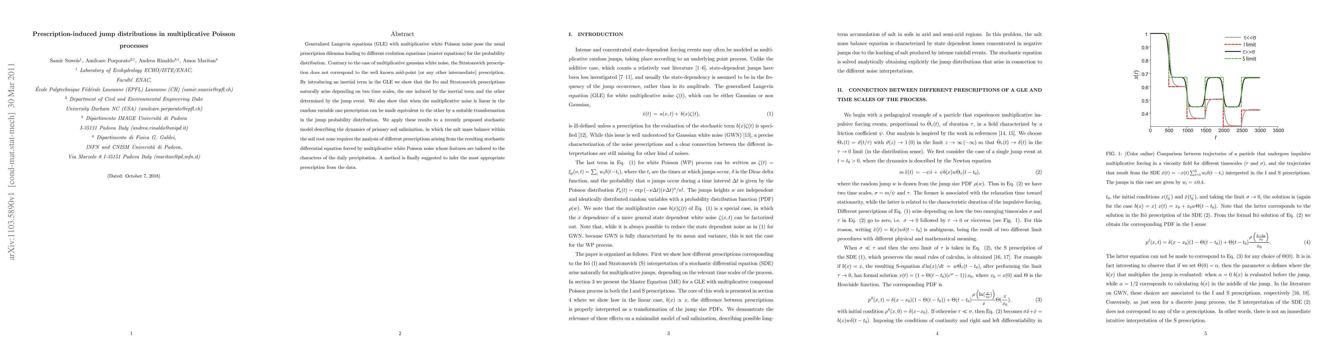 Generalized Langevin equations (GLE) with multiplicative white Poisson noise pose the usual prescription dilemma leading to different evolution equations (master equations) for the probability distribution. Contrary to the case of multiplicative gaussian white noise, the Stratonovich prescription does not correspond to the well known mid-point (or any other intermediate) prescription. By introducing an inertial term in the GLE we show that the Ito and Stratonovich prescriptions naturally arise depending on two time scales, the one induced by the inertial term and the other determined by the jump event. We also show that when the multiplicative noise is linear in the random variable one prescription can be made equivalent to the other by a suitable transformation in the jump probability distribution. We apply these results to a recently proposed stochastic model describing the dynamics of primary soil salinization, in which the salt mass balance within the soil root zone requires the analysis of different prescriptions arising from the resulting stochastic differential equation forced by multiplicative white Poisson noise whose features are tailored to the characters of the daily precipitation. A method is finally suggested to infer the most appropriate prescription from the data.