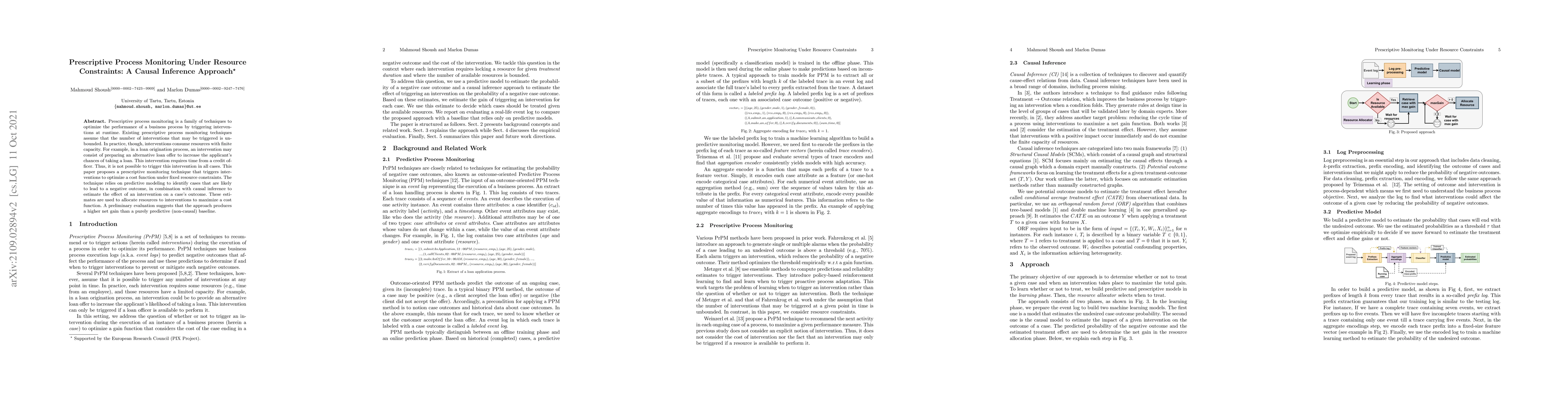 This paper introduces a prescriptive process monitoring technique that optimizes interventions under resource constraints, using predictive modeling and causal inference. The method aims to maximize a cost function by allocating resources efficiently, demonstrating higher net gains than a predictive baseline in preliminary evaluations.