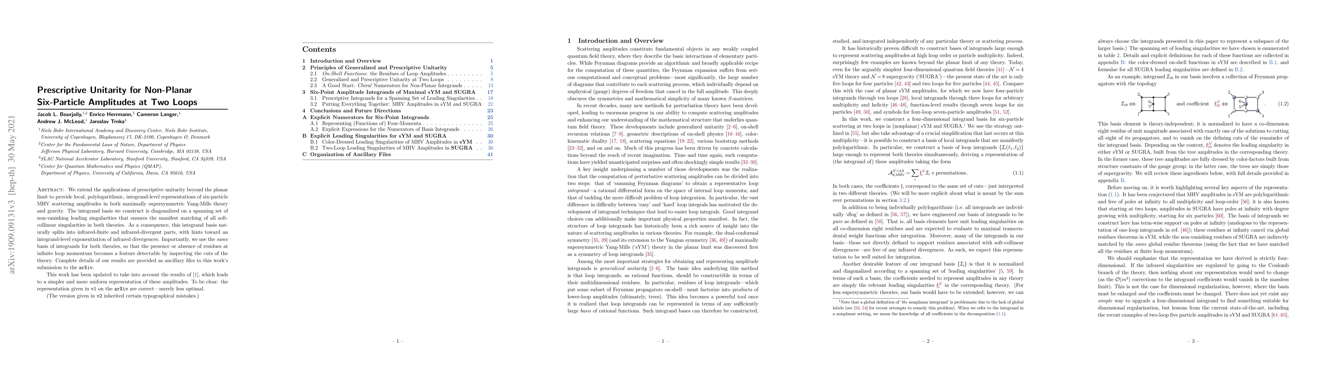 We extend the applications of prescriptive unitarity beyond the planar limit to provide local, polylogarithmic, integrand-level representations of six-particle MHV scattering amplitudes in both maximally supersymmetric Yang-Mills theory and gravity. The integrand basis we construct is diagonalized on a spanning set of non-vanishing leading singularities that ensures the manifest matching of all soft-collinear singularities in both theories. As a consequence, this integrand basis naturally splits into infrared-finite and infrared-divergent parts, with hints toward an integrand-level exponentiation of infrared divergences. Importantly, we use the same basis of integrands for both theories, so that the presence or absence of residues at infinite loop momentum becomes a feature detectable by inspecting the cuts of the theory. Complete details of our results are provided as ancillary files. This work has been updated to take into account the results of [arXiv:1911.09106], which leads to a simpler and more uniform representation of these amplitudes.