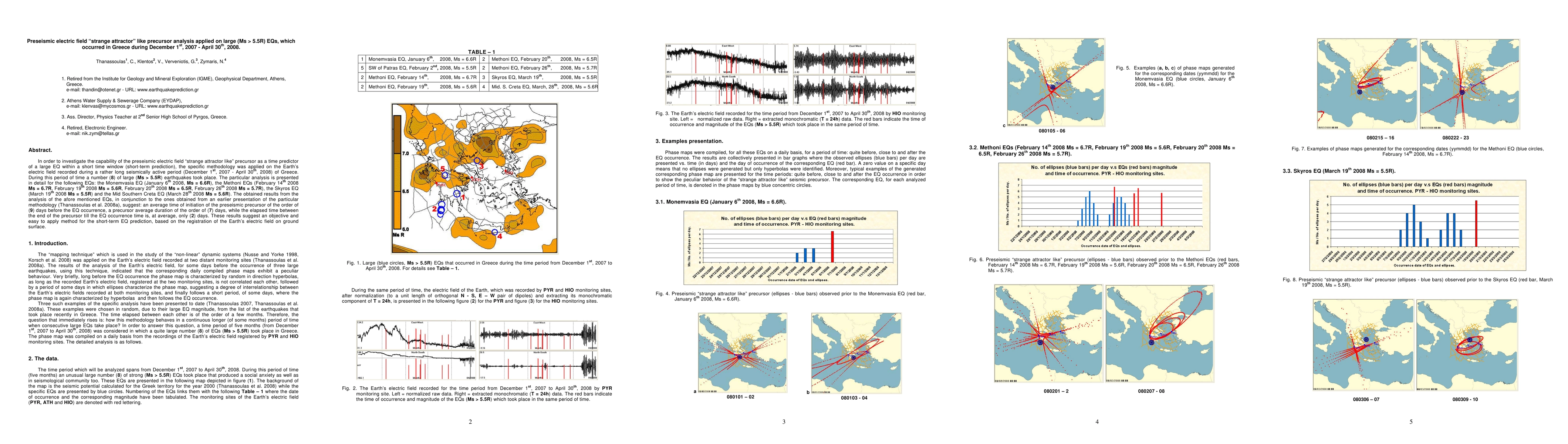 In order to investigate the capability of the preseismic electric field "strange attractor like" precursor as a time predictor of a large EQ within a short time window (short-term prediction), the specific methodology was applied on the Earth's electric field recorded during a rather long seismically active period (December 1st, 2007 - April 30th, 2008) of Greece. During this period of time a number (8) of large (Ms > 5.5R) earthquakes took place. The particular analysis is presented in detail for the following EQs: the Monemvasia EQ (January 6th 2008, Ms = 6.6R), the Methoni EQs (February 14th 2008 Ms = 6.7R, February 19th 2008 Ms = 5.6R, February 20th 2008 Ms = 6.5R, February 26th 2008 Ms = 5.7R), the Skyros EQ (March 19th 2008 Ms = 5.5R) and the Mid Southern Creta EQ (March 28th 2008 Ms = 5.6R). The obtained results from the analysis of the afore mentioned EQs, in conjunction to the ones obtained from an earlier presentation of the particular methodology (Thanassoulas et al. 2008a), suggest: an average time of initiation of the preseismic precursor of the order of (9) days before the EQ occurrence, a precursor average duration of the order of (7) days, while the elapsed time between the end of the precursor till the EQ occurrence time is, at average, only (2) days. These results suggest an objective and easy to apply method for the short-term EQ prediction, based on the registration of the Earth's electric field on ground surface.