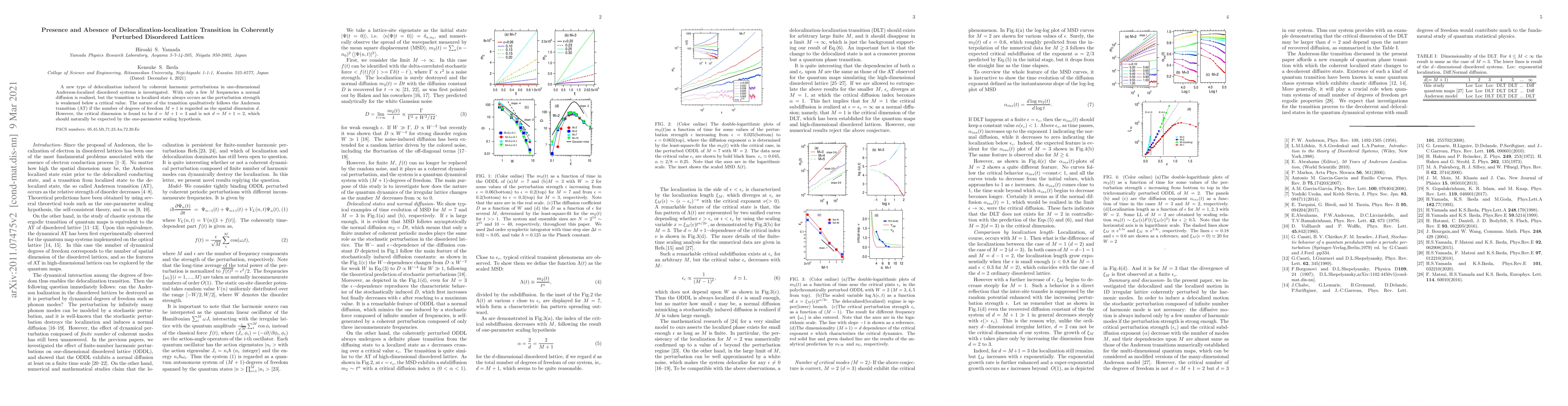 This paper investigates delocalization induced by coherent harmonic perturbations in one-dimensional localized systems, finding that normal diffusion occurs with a few perturbation frequencies but transitions to localization below a critical strength. The transition's nature follows the Anderson transition, albeit with a critical dimension of $d=3$ instead of $d=M+1-2$.