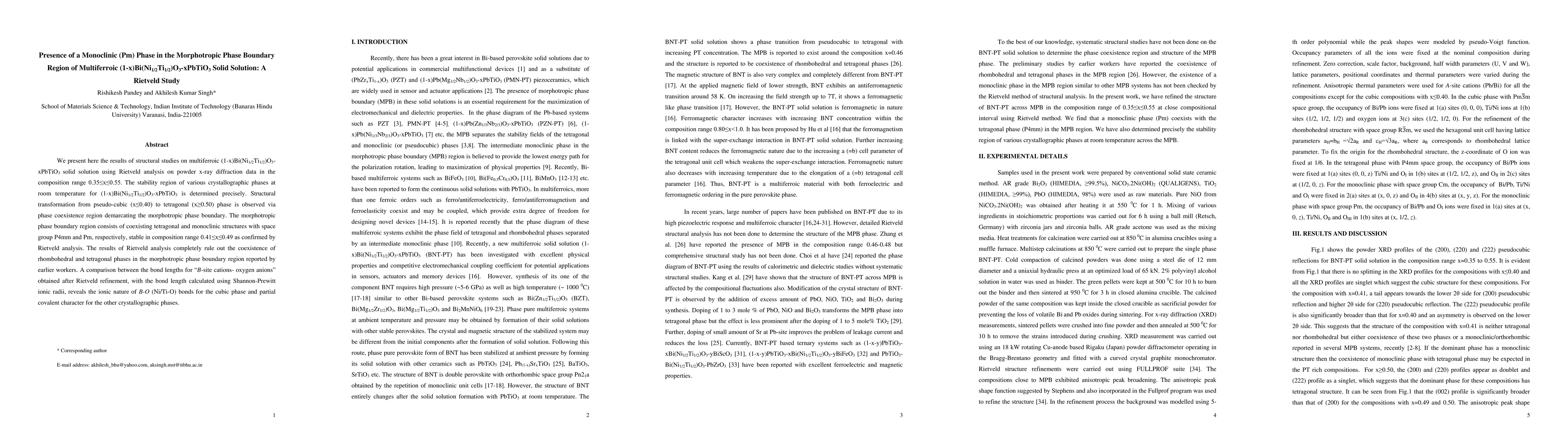 This study uses Rietveld analysis to determine the crystallographic phases in the multiferroic solid solution (1-x)Bi(Ni1/2Ti1/2)O3-xPbTiO3, identifying a monoclinic (Pm) phase in the morphotropic phase boundary region. The analysis confirms the coexistence of tetragonal and monoclinic phases in the composition range 0.41 to 0.49, refuting earlier reports of rhombohedral and tetragonal coexistence.