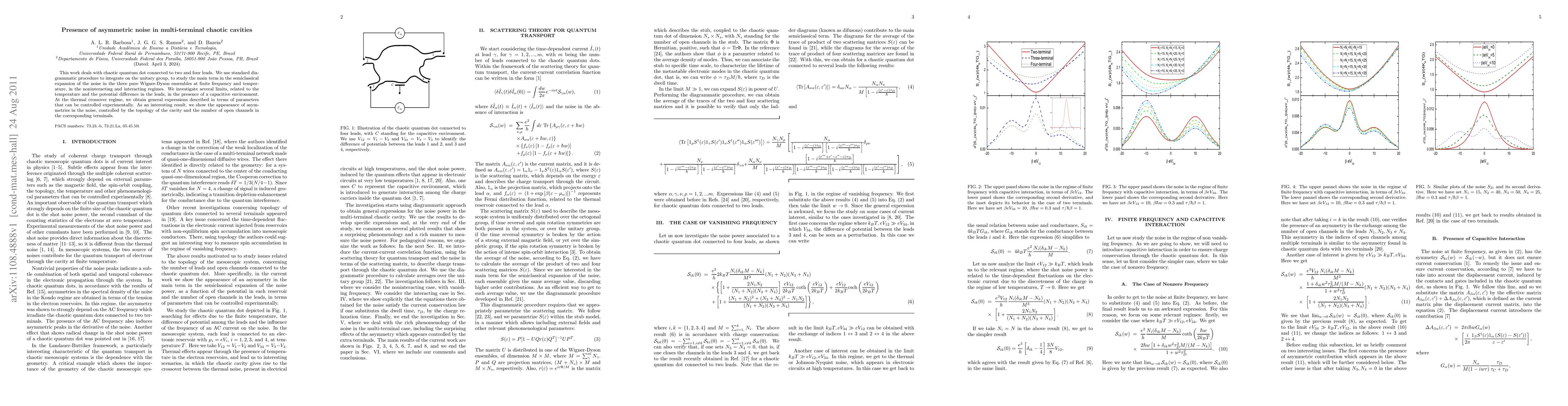 Researchers studied noise in chaotic quantum dots connected to two and four leads, finding asymmetries controlled by cavity topology and open channels, with general expressions at thermal crossover regime.
