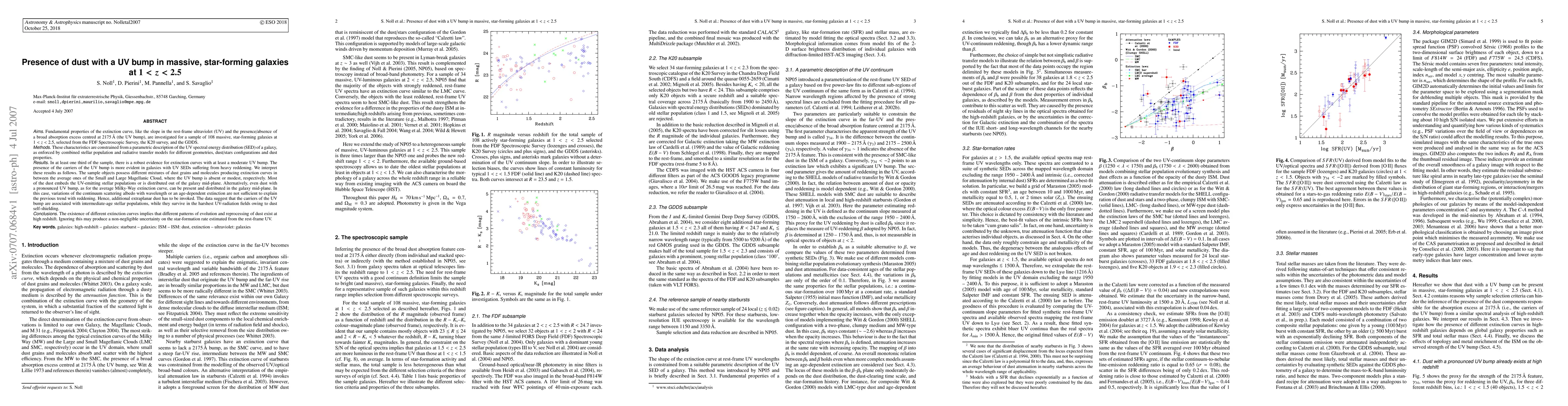 Fundamental properties of the extinction curve, like the slope in the rest-frame ultraviolet (UV) and the presence/absence of a broad absorption excess centred at 2175 A (the UV bump), are investigated for a sample of 108 massive, star-forming galaxies at 1 < z < 2.5, selected from the FDF Spectroscopic Survey, the K20 survey, and the GDDS. These characteristics are constrained from a parametric description of the UV spectral energy distribution (SED) of a galaxy, as enforced by combined stellar population and radiative transfer models for different geometries, dust/stars configurations and dust properties. In at least one third of the sample, there is a robust evidence for extinction curves with at least a moderate UV bump. The presence of the carriers of the UV bump is more evident in galaxies with UV SEDs suffering from heavy reddening. We interpret these results as follows. The sample objects possess different mixtures of dust grains and molecules producing extinction curves in between the average ones of the Small and Large Magellanic Cloud, where the UV bump is absent or modest, respectively. Most of the dust embeds the UV-emitting stellar populations or is distributed out of the galaxy mid-plane. Alternatively, even dust with a pronounced UV bump, as for the average Milky-Way extinction curve, can be present and distributed in the galaxy mid-plane. In this case, variations of the continuum scattering albedo with wavelength or an age-dependent extinction are not sufficient to explain the previous trend with reddening. Hence, additional extraplanar dust has to be invoked. The data suggest that the carriers of the UV bump are associated with intermediate-age stellar populations, while they survive in the harshest UV-radiation fields owing to dust self-shielding. [abridged]
