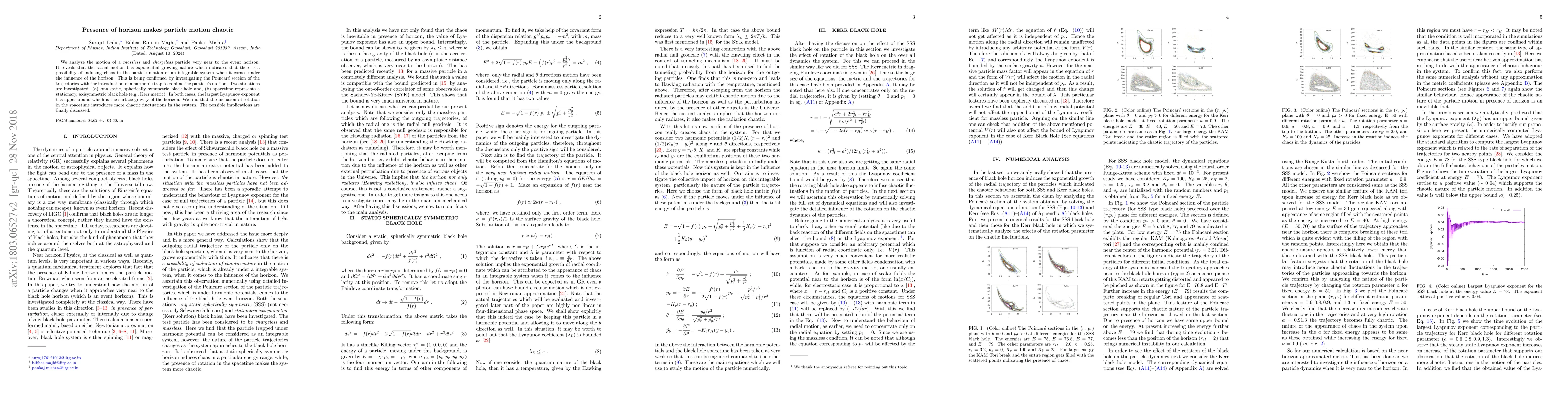 We analyze the motion of a {\it massless} and {\it chargeless} particle very near to the event horizon. It reveals that the radial motion has exponential growing nature which indicates that there is a possibility of inducing chaos in the particle motion of an integrable system when it comes under the influence of the horizon. This is being confirmed by investigating the Poincar$\acute{e}$ section of the trajectories with the introduction of a harmonic trap to confine the particle's motion. Two situations are investigated: (a) {\it any} static, spherically symmetric black hole and, (b) spacetime represents a stationary, axisymmetric black hole (e.g., Kerr metric). In both cases, the largest Lyapunov exponent has upper bound which is the surface gravity of the horizon. We find that the inclusion of rotation in the spacetime introduces more chaotic fluctuations in the system. The possible implications are finally discussed.