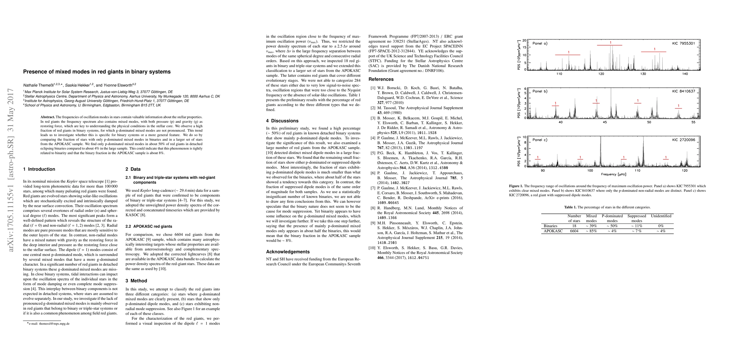 The frequencies of oscillation modes in stars contain valuable information about the stellar properties. In red giants the frequency spectrum also contains mixed modes, with both pressure (p) and gravity (g) as restoring force, which are key to understanding the physical conditions in the stellar core. We observe a high fraction of red giants in binary systems, for which g-dominated mixed modes are not pronounced. This trend leads us to investigate whether this is specific for binary systems or a more general feature. We do so by comparing the fraction of stars with only p-dominated mixed modes in binaries and in a larger set of stars from the APOKASC sample. We find only p-dominated mixed modes in about 50% of red giants in detached eclipsing binaries compared to about 4% in the large sample. This could indicate that this phenomenon is tightly related to binarity and that the binary fraction in the APOKASC sample is about 8%.