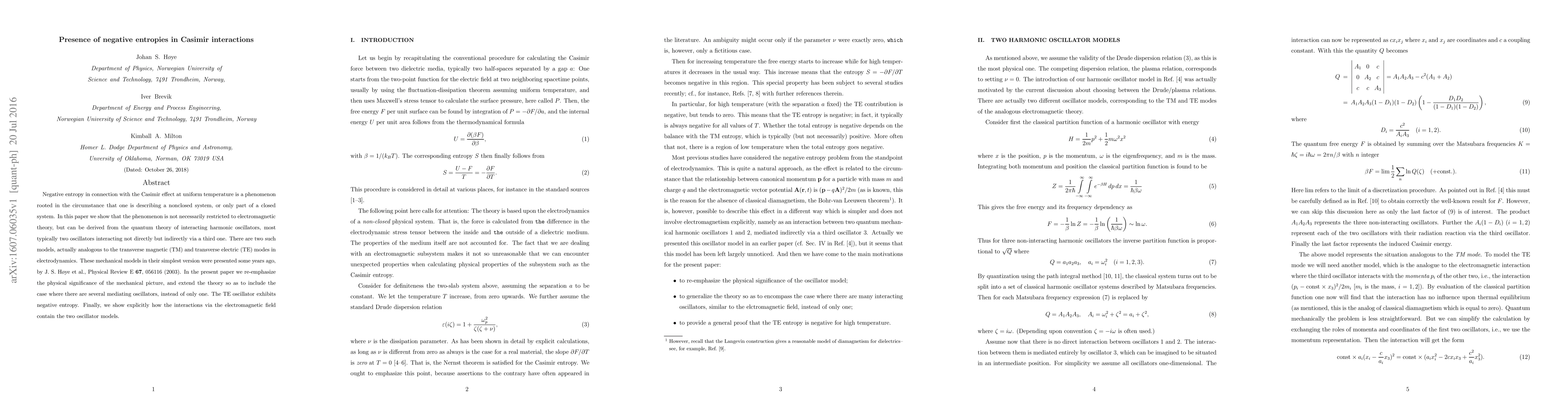 Negative entropy in connection with the Casimir effect at uniform temperature is a phenomenon rooted in the circumstance that one is describing a nonclosed system, or only part of a closed system. In this paper we show that the phenomenon is not necessarily restricted to electromagnetic theory, but can be derived from the quantum theory of interacting harmonic oscillators, most typically two oscillators interacting not directly but indirectly via a third one. There are two such models, actually analogous to the transverse magnetic (TM) and transverse electric (TE) modes in electrodynamics. These mechanical models in their simplest version were presented some years ago, by J. S. H{\o}ye et al., Physical Review E {\bf 67}, 056116 (2003). In the present paper we re-emphasize the physical significance of the mechanical picture, and extend the theory so as to include the case where there are several mediating oscillators, instead of only one. The TE oscillator exhibits negative entropy. Finally, we show explicitly how the interactions via the electromagnetic field contain the two oscillator models.