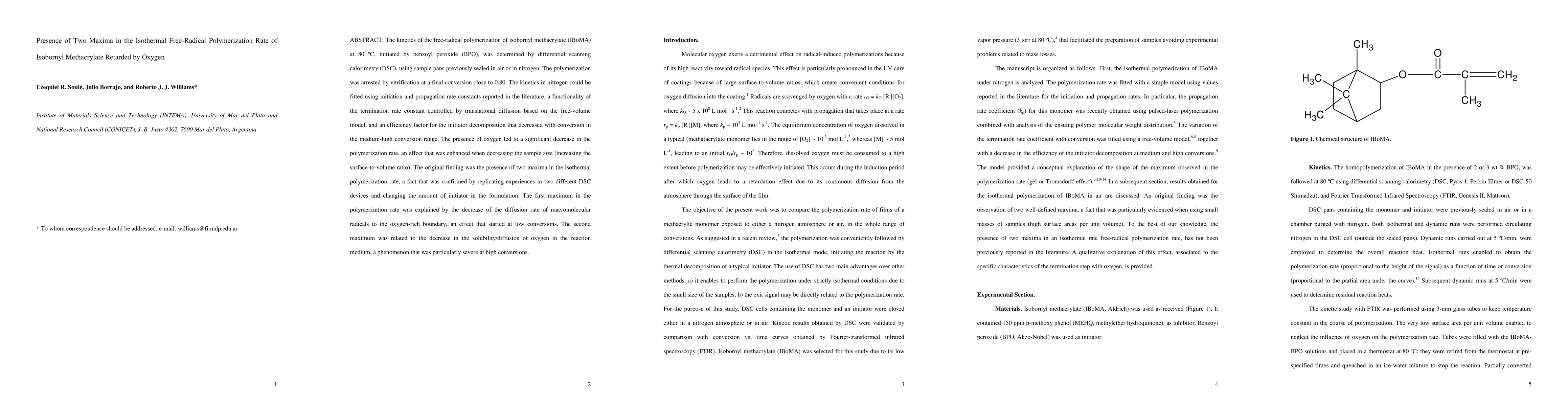 This study investigates the kinetics of isothermal free-radical polymerization of isobornyl methacrylate, revealing two distinct maxima in the polymerization rate under oxygen presence. The first maximum is attributed to reduced diffusion of macromolecular radicals to oxygen, while the second is linked to the decreased solubility/diffusion of oxygen at high conversions.