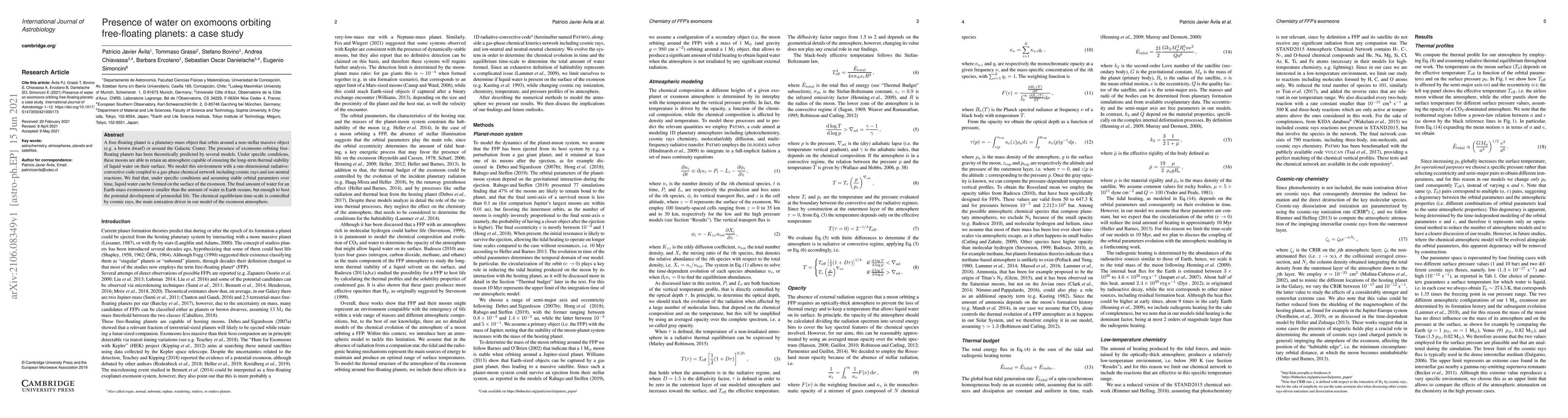 This study investigates the possibility of liquid water on exomoons orbiting free-floating planets, using a one-dimensional radiative-convective model. It finds that under specific conditions, these moons can retain enough water to potentially support primordial life, though in smaller quantities than Earth's oceans.