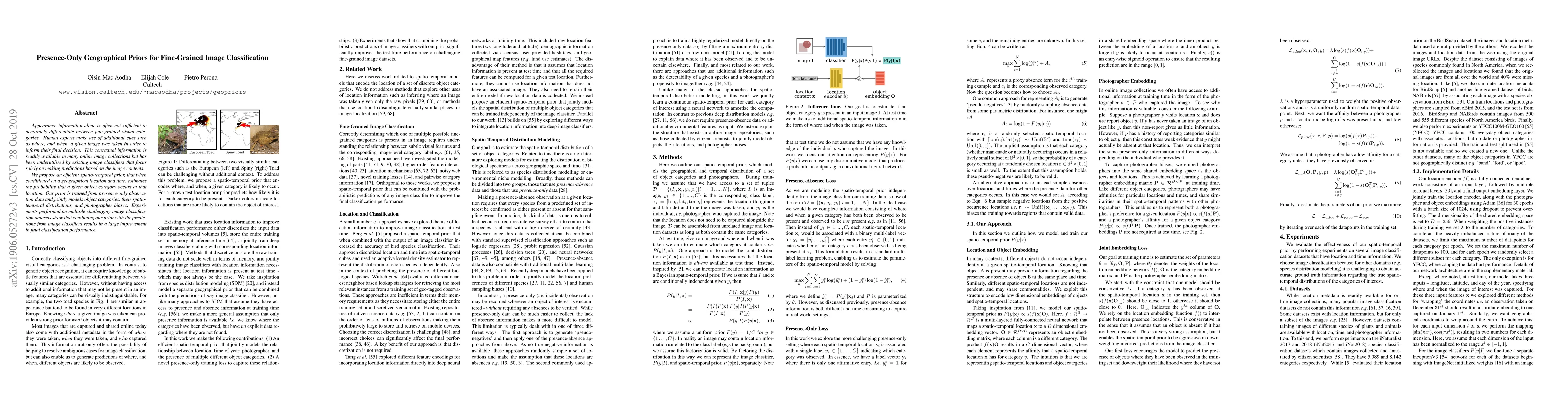 Appearance information alone is often not sufficient to accurately differentiate between fine-grained visual categories. Human experts make use of additional cues such as where, and when, a given image was taken in order to inform their final decision. This contextual information is readily available in many online image collections but has been underutilized by existing image classifiers that focus solely on making predictions based on the image contents. We propose an efficient spatio-temporal prior, that when conditioned on a geographical location and time, estimates the probability that a given object category occurs at that location. Our prior is trained from presence-only observation data and jointly models object categories, their spatio-temporal distributions, and photographer biases. Experiments performed on multiple challenging image classification datasets show that combining our prior with the predictions from image classifiers results in a large improvement in final classification performance.