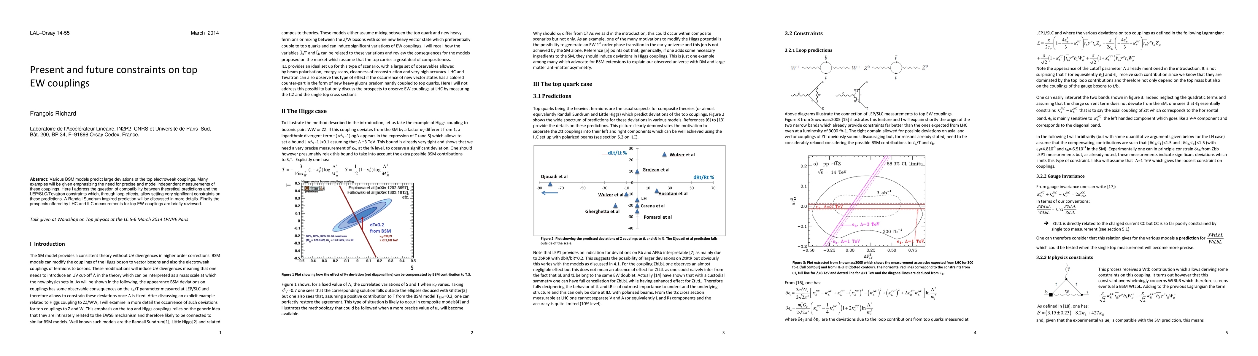 Various BSM models predict large deviations of the top electroweak couplings. Many examples will be given emphasizing the need for precise and model independent measurements of these couplings. Here I address the question of compatibility between theoretical predictions and the LEP/SLC/Tevatron constraints which, through loop effects, allow setting very significant constraints on these predictions. A Randall Sundrum inspired prediction will be discussed in more details. Finally the prospects offered by LHC and ILC measurements for top EW couplings are briefly reviewed.