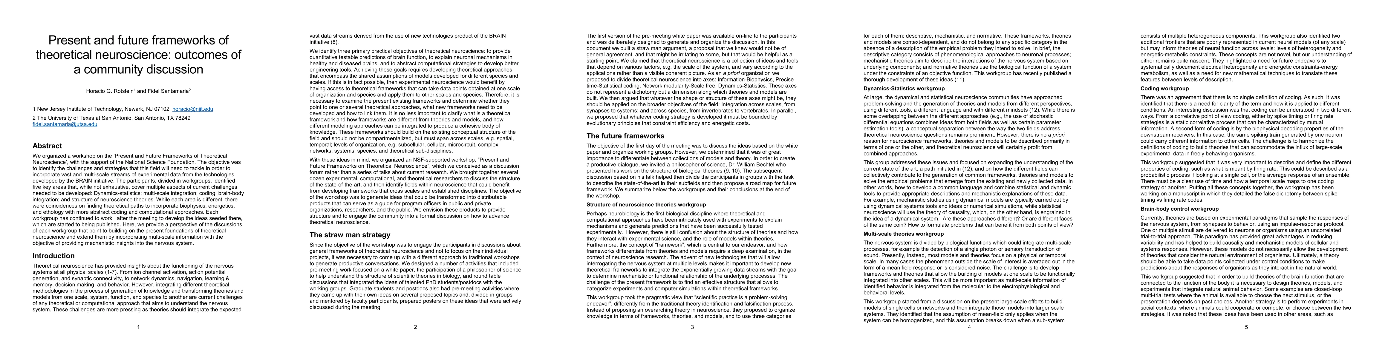 We organized a workshop on the "Present and Future Frameworks of Theoretical Neuroscience", with the support of the National Science Foundation. The objective was to identify the challenges and strategies that this field will need to tackle in order to incorporate vast and multi-scale streams of experimental data from the technologies developed by the BRAIN initiative. The participants, divided in workgroups, identified five key areas that, while not exhaustive, cover multiple aspects of current challenges needed to be developed: Dynamics-statistics; multi-scale integration; coding; brain-body integration; and structure of neuroscience theories. While each area is different, there were coincidences on finding theoretical paths to incorporate biophysics, energetics, and ethology with more abstract coding and computational approaches. Each workgroup has continued to work after the meeting to develop the ideas seeded there, which are started to being published. Here, we provide a perspective of the discussions of each workgroup that point to building on the present foundations of theoretical neuroscience and extend them by incorporating multi-scale information with the objective of providing mechanistic insights into the nervous system.