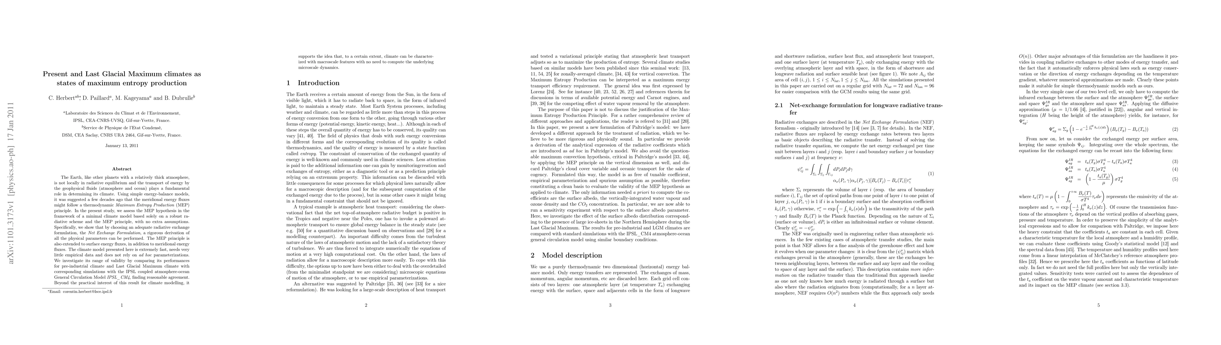 This study explores the Maximum Entropy Production (MEP) principle in a minimal climate model to understand present and Last Glacial Maximum climates. The model, based on a robust radiative scheme and MEP, shows reasonable agreement with more complex simulations, suggesting climate can be characterized by macroscale features without detailed microscale dynamics.
